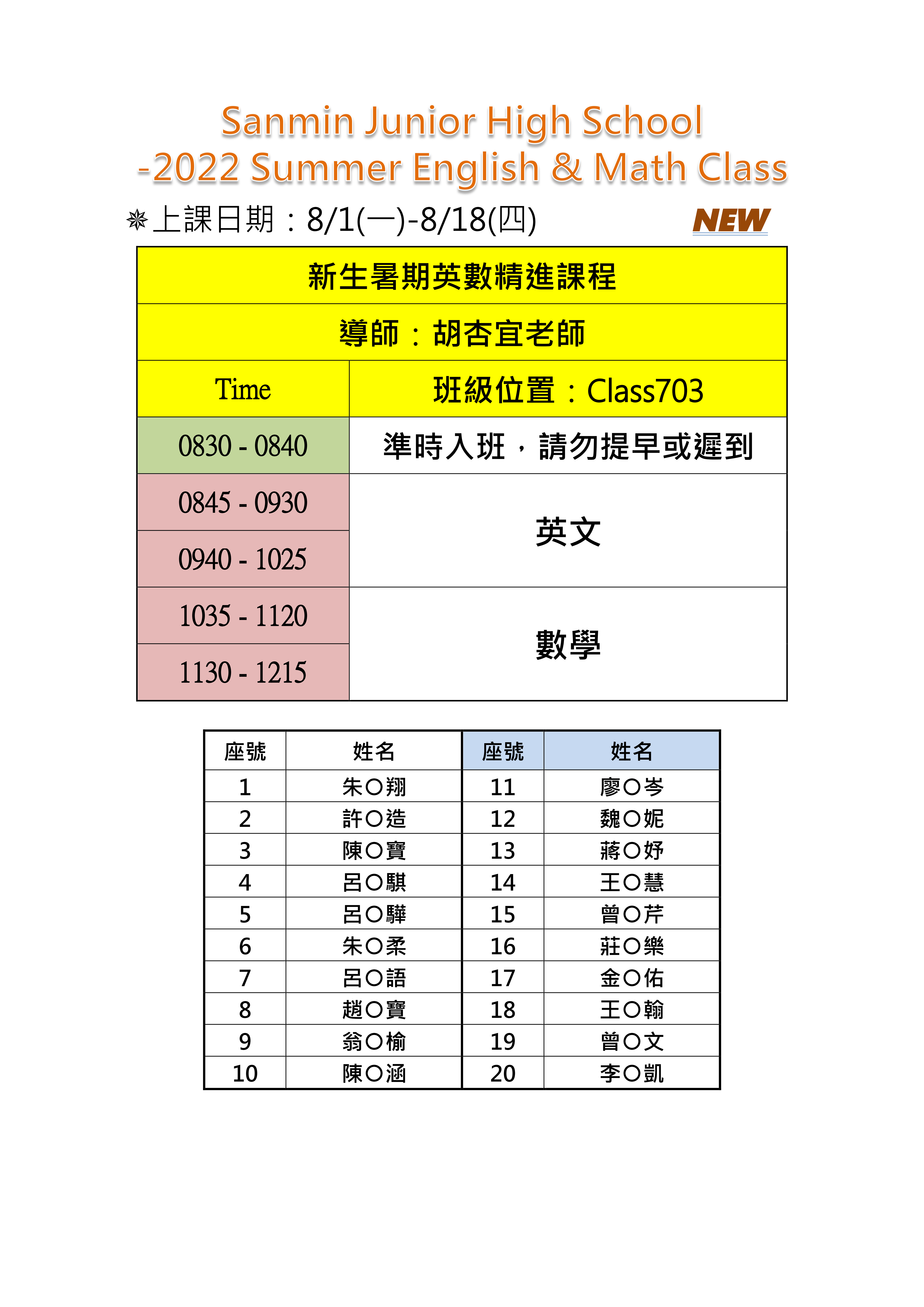 新生「暑期英數學習扶助班」課程及錄取名單如下, 開課時間:8/1(一)至8/18(四),每日8:45-12:15 8/1(一)首日穿堂佈置引導海報, 請錄取的同學8:30-8:40準時到班點名, 切勿過於提早或遲到。
