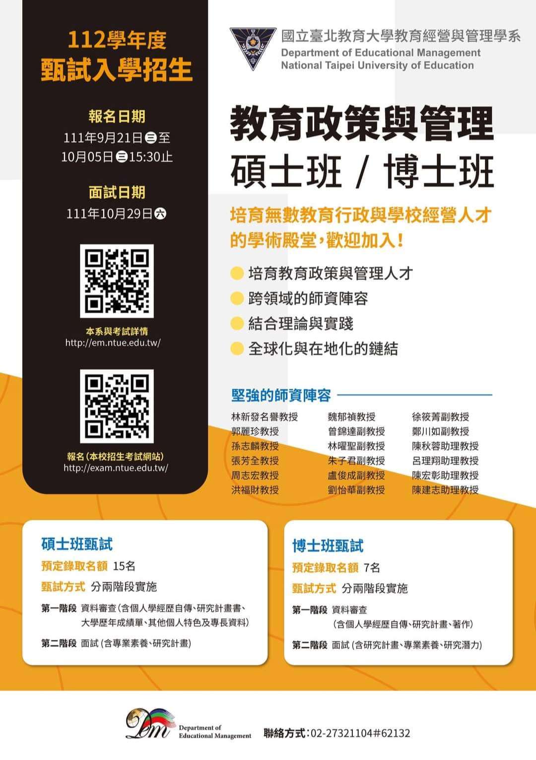 一、該校112學年度教育經營與管理學系碩博士班甄試(包括教