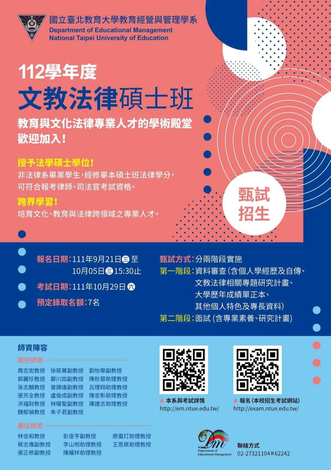 育政策與管理碩士班、博士班、文教法律碩士班)之招生名