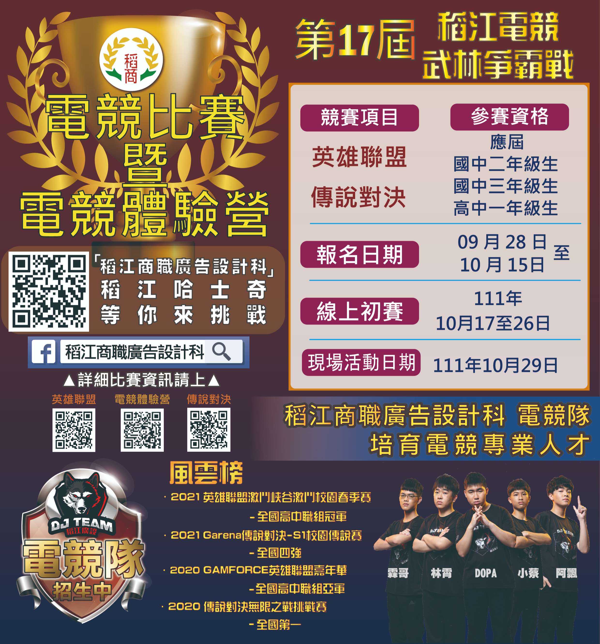 一、本校於10月29日(六)9~16點舉辦【稻江電競舞林爭霸戰及電競體驗營】,歡迎有興趣的同學踴躍報名,請有興趣的同學利用報名QR碼回傳。