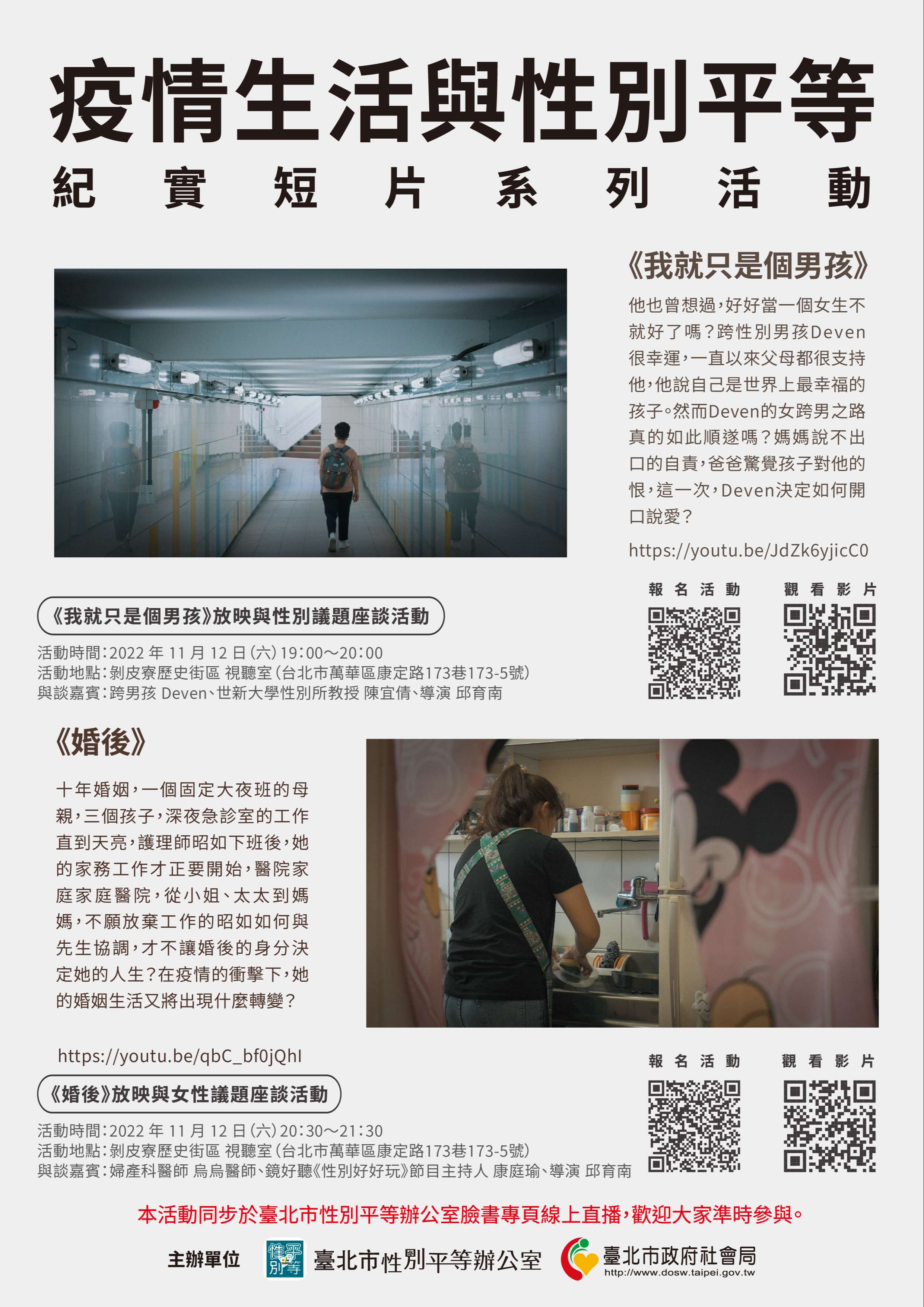 二、本市性別平等辦公室為擴展性平議題宣導之多元性與豐富 性,本年度聚焦「疫情生活與性別平等」,分別製作《我 就只是個男孩》及《婚後》2支紀實短片: (一)《我就只是個男孩》:由跨性別男孩Deven的生命故事切 入,討論主角於家庭、醫療及職場等生活交織議題,逐 步深入至臺灣政策制度與跨性別社會處境,以及涉及消 除對婦女一切形式歧視公約(CEDAW)相關內容。 (二)《婚後》:看見女性護理師於疫情下職業處境及家庭生 活中的性別議題,以及涉及消除對婦女一切形式歧視公 約(CEDAW)相關內容,促進社會大眾對性別平等的重視及了解。 三、為提高民眾觀看短片及學習性別平等知能之意願,即日起 至111年11月12日(六)止,於觀影後在影片討論區留言、 並分享本市性別平等辦公室臉書專頁特定貼文,便有機會 獲得精美禮 品。活動詳情請見該辦公室臉書專頁 (https://www. facebook.com/ogeTaipei)。 四、本市性別平等辦公室將在111年11月12日(六)晚上7時至9 時30分於剝皮寮歷史街區視聽室(臺北市萬華區康定路173 巷173-5 號)辦理「放映座談活動」,當日亦同步於該辦 公室臉書專頁開放直播,歡迎大家線上參與。 五、檢附疫情生活與性別平等紀實短片宣傳圖1份。
