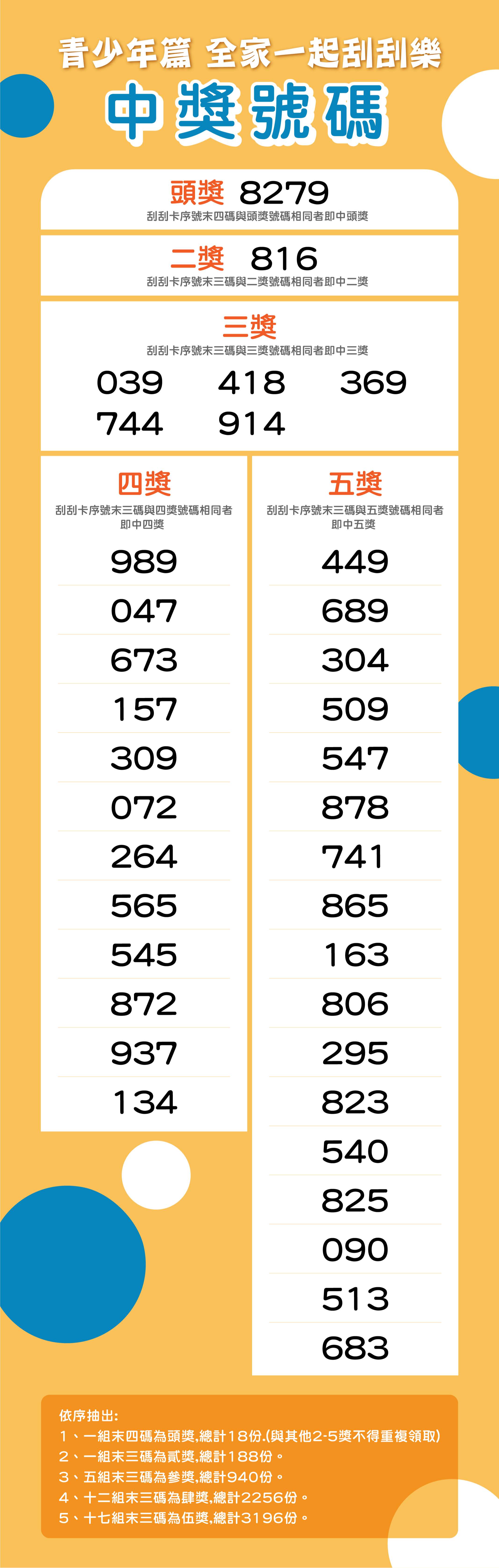 二、本局配合教育部規劃,業將旨揭開學禮袋於111年8月底配 送至貴校,案內國中一年級新生開學禮袋搭配辦理刮刮卡 抽獎活動,教育部111年9月1日於家庭教育資源網 (https://gov.tw/9Rr)公布得獎序號,兌獎期限延長至 111年12月2日(星期五)止,請貴校協助公告並向一年級 新生及家長宣導兌獎事宜。