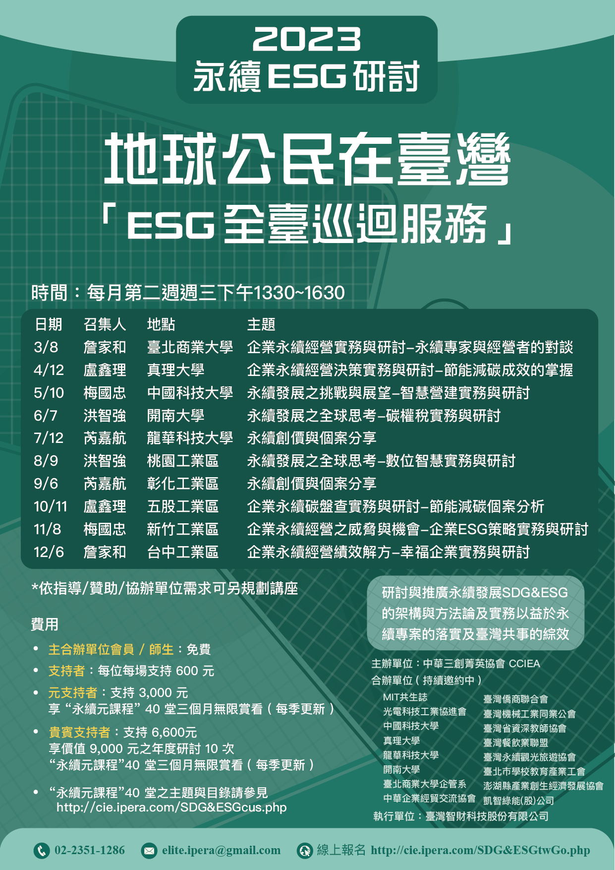 二、【地球公民在台灣】【ESG全臺巡迴服務】系列活動請參閱下列網址: