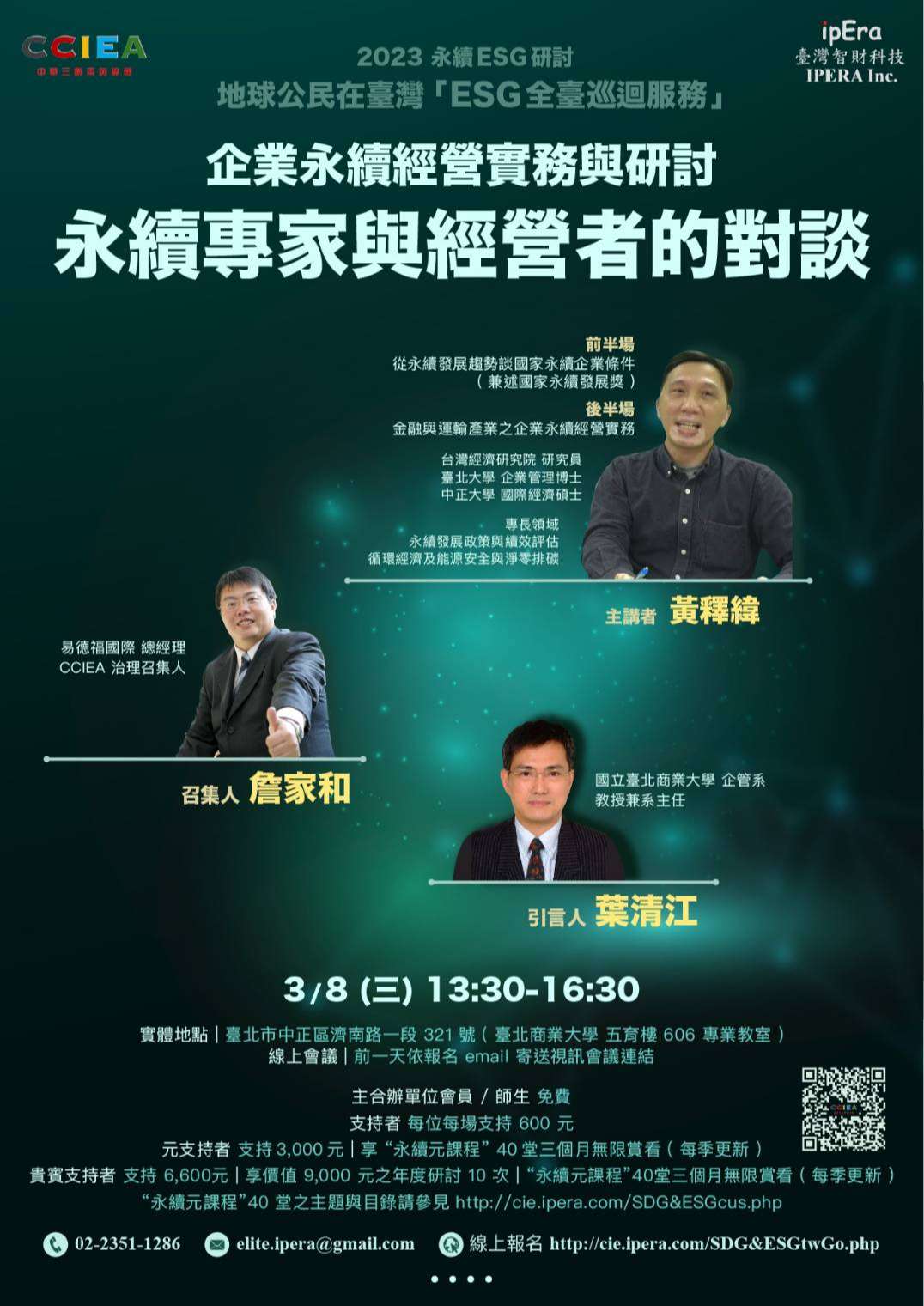 一、首場研討會訂於:112年3月8日(三)13:30-16:30假臺北市中正區濟南路一段321號(臺北商業大學五育樓606專業教室)。研討主題:永續專家與經營者的對談。