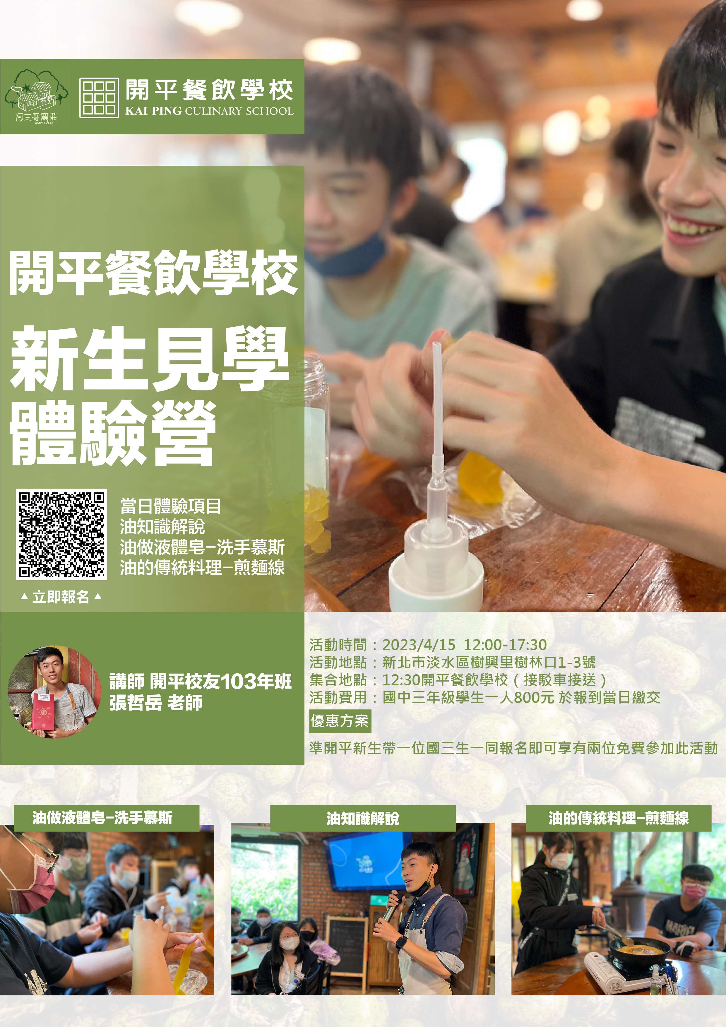 一、為協助對餐飲有興趣的國中生,透過有趣的專業實作,建立生涯想像,本校訂於112年4月8日(六)辦理「雙語新生見學體驗營30人」、4月15日(六)辦理「新生見學營體驗營30人」,歡迎有興趣的同學報名參加。