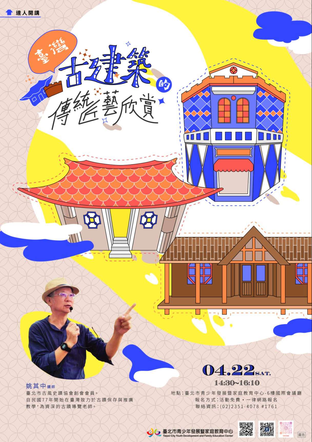 臺北市青少年發展暨家庭教育中心4月22日14:30舉辦壯遊達人開講「臺灣古建築的傳統匠藝欣賞」,姚其中老師領讀臺灣古蹟之美,提昇青年學子對臺灣古建築的欣賞能力。活動免費,詳見青發家教中心官網。