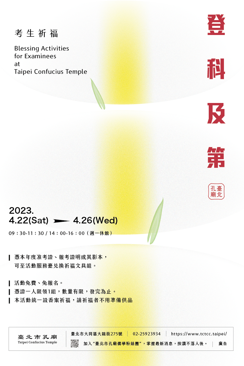 一、旨揭活動祈願考生充滿信心迎接考試,參加者可獲得限量 祈福文具組,祝福應試順利一舉高中。活動資訊如下: (一)活動時間:4月22日至26日(4月24日週一休館)上午9時 30分至11時30分;下午2時至4時。 (二)憑當年度准考證、報考證明或其影本(僅供現場查驗), 即可參加。