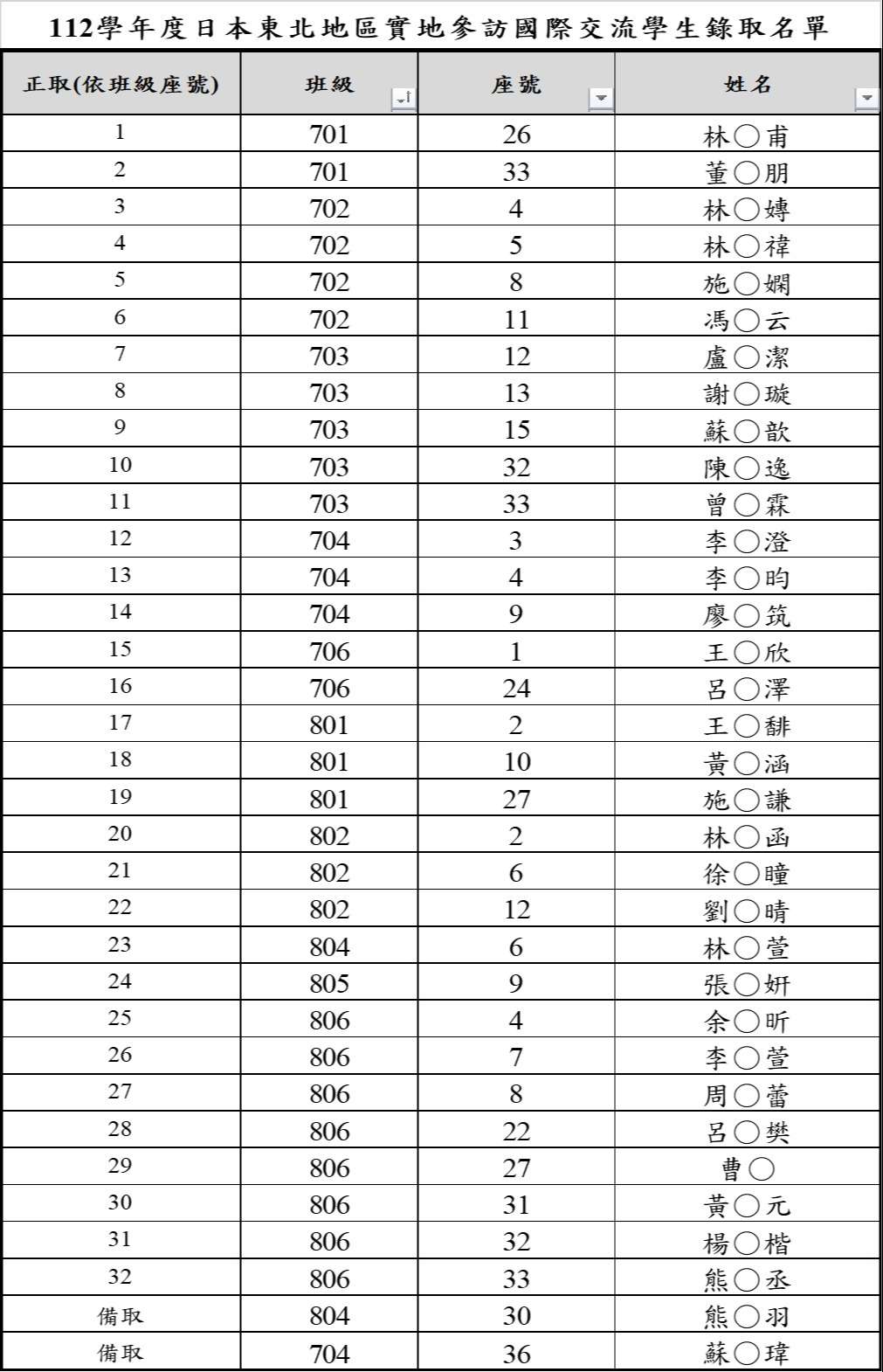 本錄取名單依學生班級座號排序