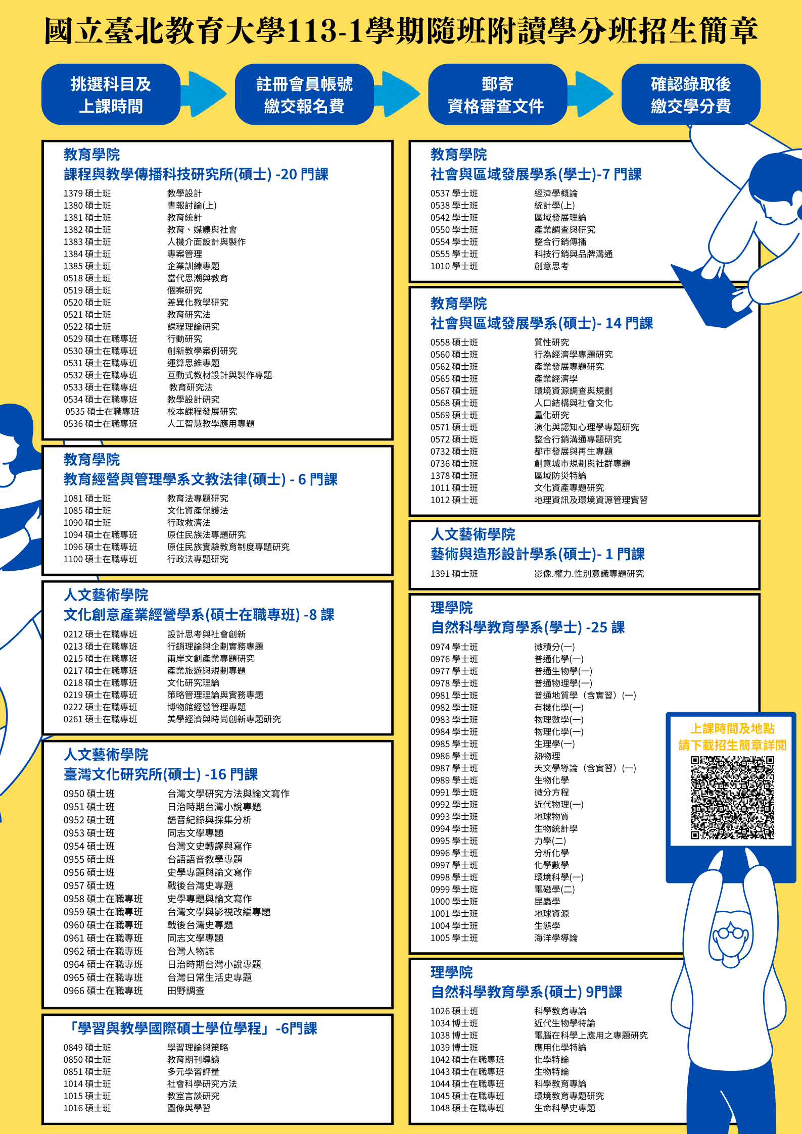 六、報名方式:請於報名時間內線上報名(https://cce.ntue.edu.tw/course/5288 )、繳交報名費、郵寄紙本申請書及相關附件。113年9月16日公告錄取名單後,再行繳納學分費用及行政業務費。
