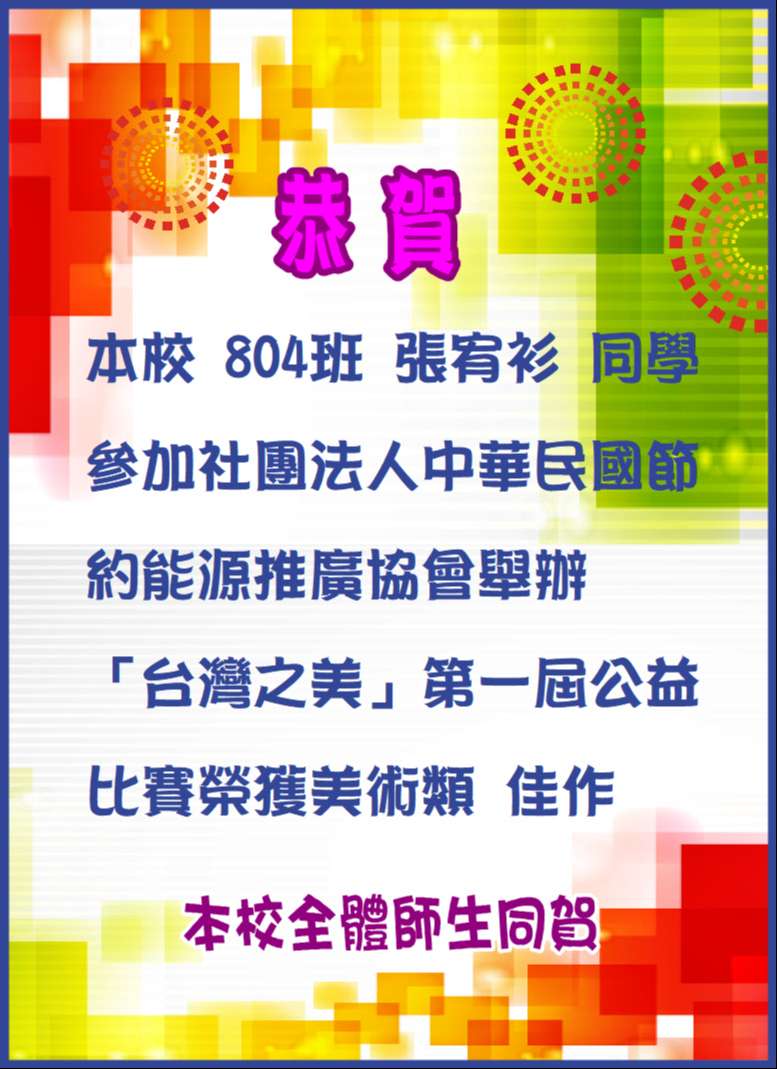 本校804班張宥衫同學參加社團法人中華民國節約能源推廣協會舉辦「台灣之美」第一屆公益比賽美術類佳作
