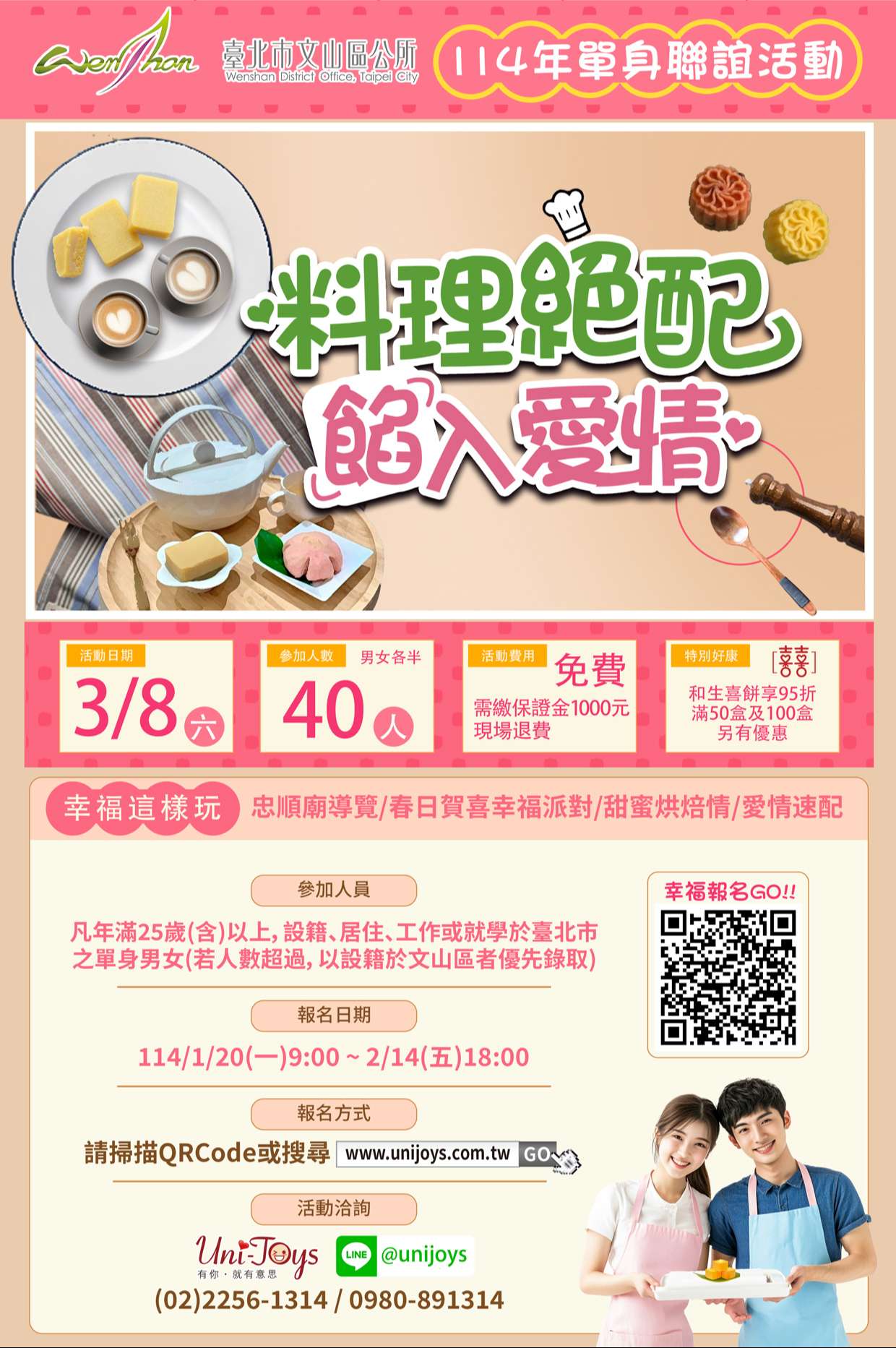臺北市文山區公所114年度單身聯誼活動『料理絕配餡入愛情』,將於114年3月8日(星期六)下午1時至下午6 時假臺北市文山區忠順區民活動中心辦理,線上報名時間 自114年1月20日(星期一)上午9時起至114年2月14日(星 期五)下午6時或額滿為止,凡年滿25歲以上,設籍、居 住、工作或就學於臺北市之未婚者,總計40個名額,男女 各20人,免費參加,活動詳情請見該區公所官網或電洽2936- 5522轉355吳小姐。