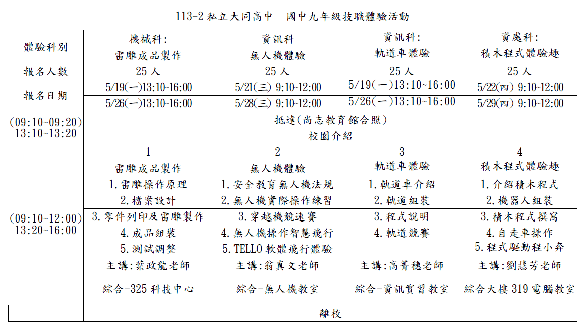 一、本校資訊科、資處科等於5/19(一)~5/29(四)期間安排國中九年級技職課程體驗課程,包括:自走車、無人機、軌道車、雷雕成品製作等共8組,每組25名,課程詳情請參考附件。