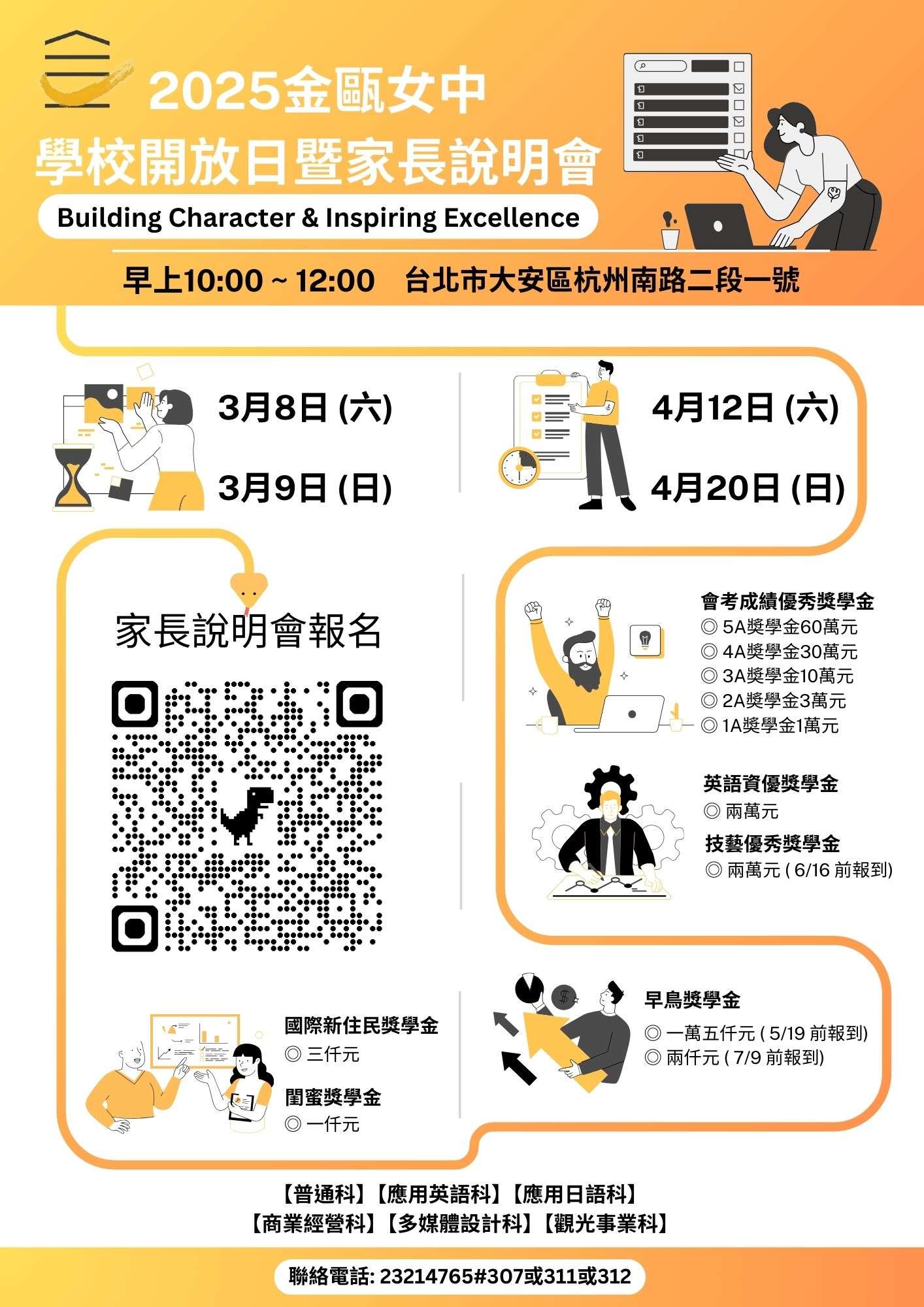 本校定於民國114年3月8日、9日、4月10日、12日上午10時 至12時於本校辦理【招生家長說明會】活動。名方式:即日起至114年4月12日(星期六)止,請逕至金 甌女中首頁(網址:https://www.cogsh.tp.edu.tw/home) 掃QR Code、或直接至Google表單(網址:https://https: //forms.gle/DHQJaG4gHAYqZwm78)報名參加。