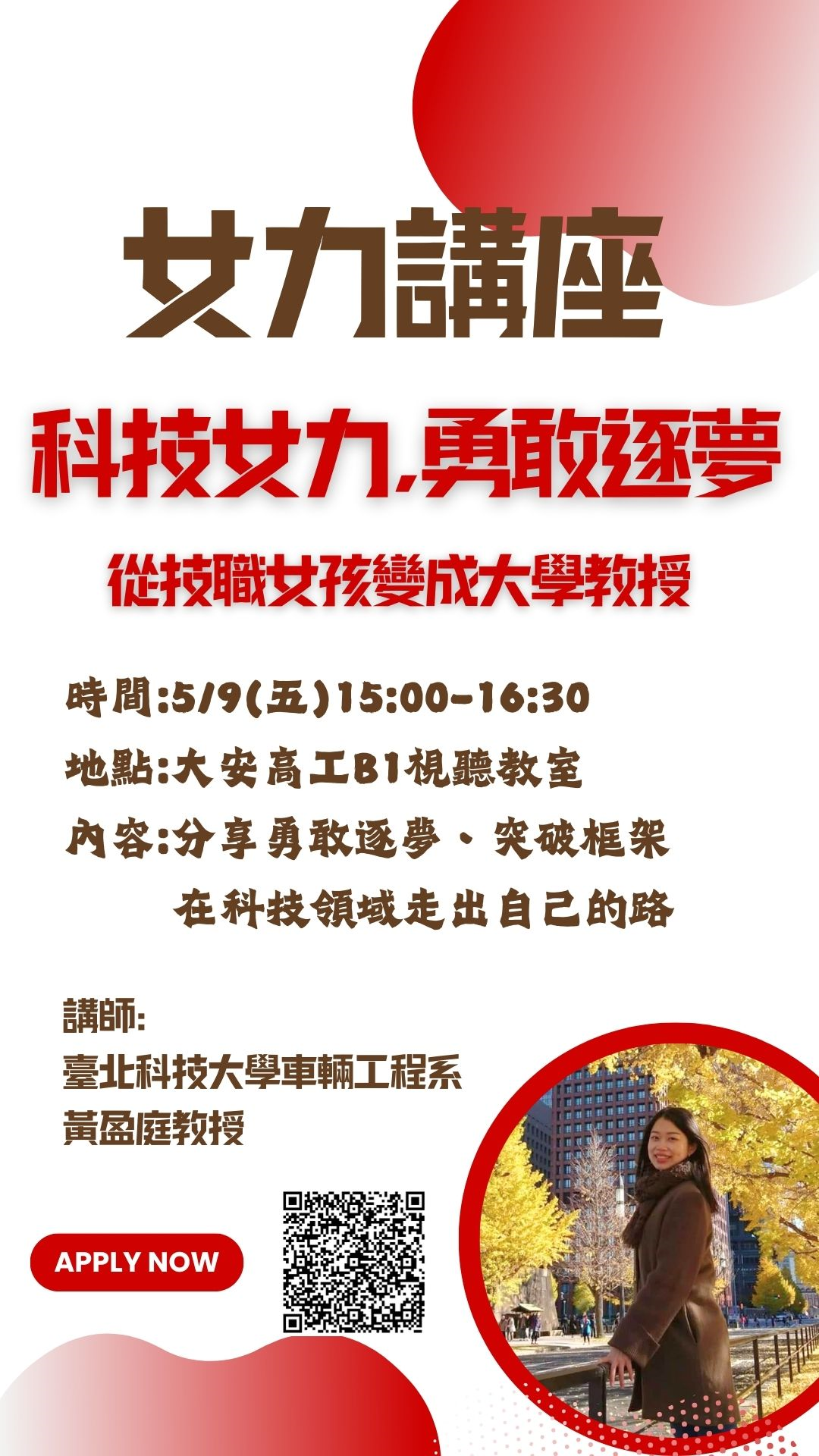 (五)內容:從技職女孩變身大學教授,分享如何勇敢追夢、突破框架,在科技領域走出自己的路。