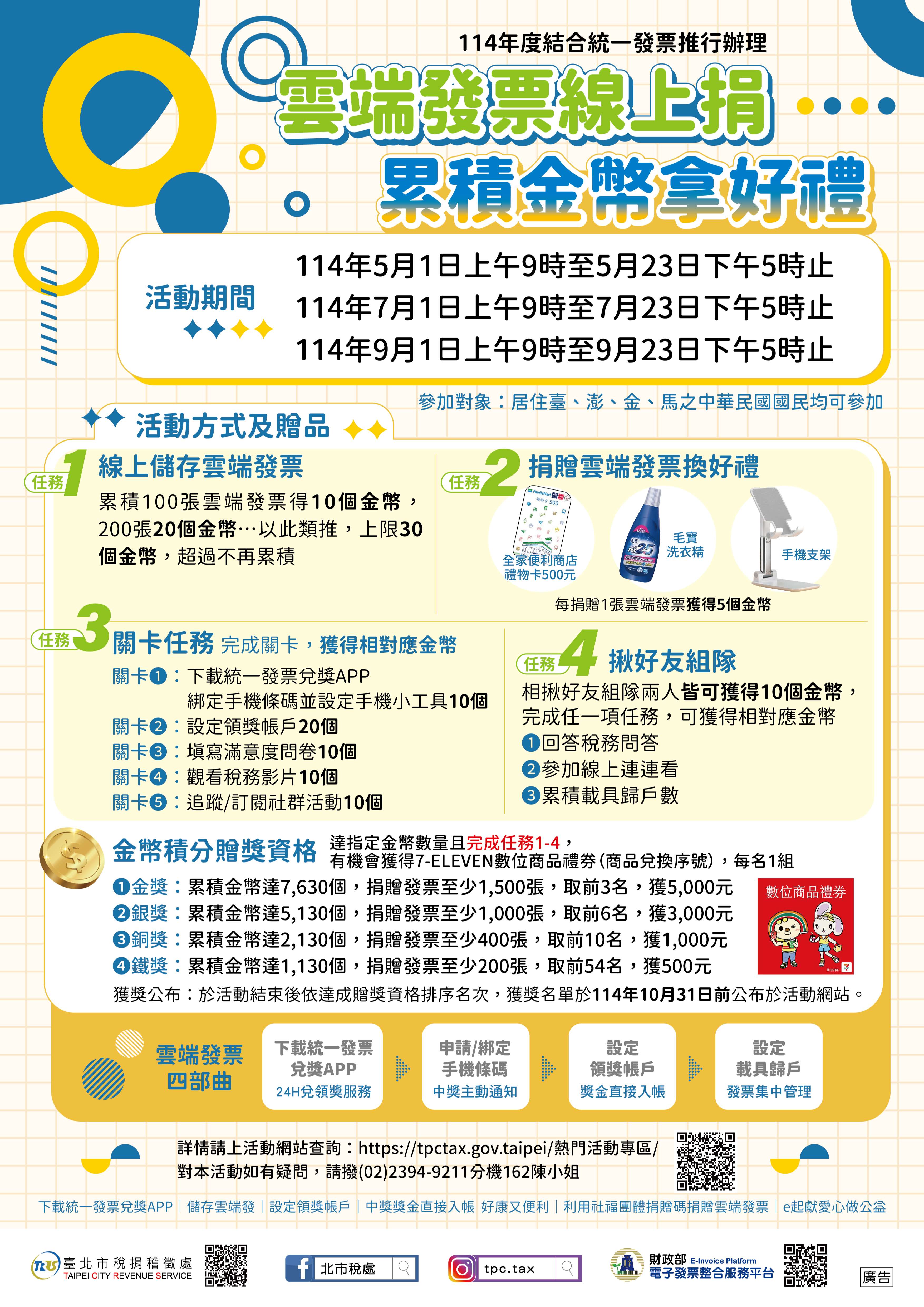 臺北市稅捐稽徵處舉辦114年結合統一發票推行辦理 「雲端發票線上捐 累積金幣拿好禮」活動租稅宣導活動DM電子檔(如附件),