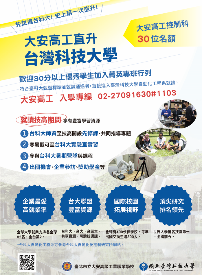 二、本市大安高工與國立臺灣科技大學合作3+2新五專模式「直升臺科大專班」,為具實作潛力學生打造直升國立科技大學的入學管道,鼓勵學生投入技職領域學習專業技術與實作。