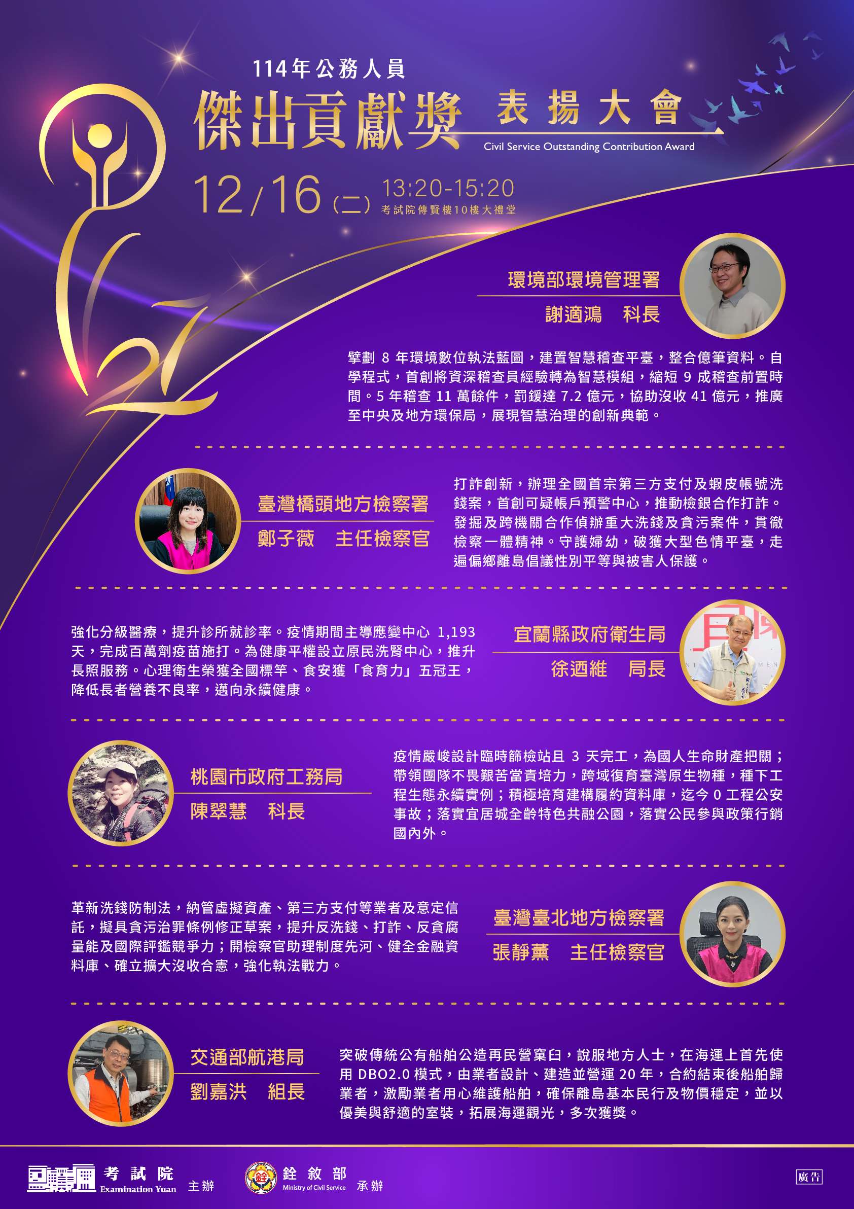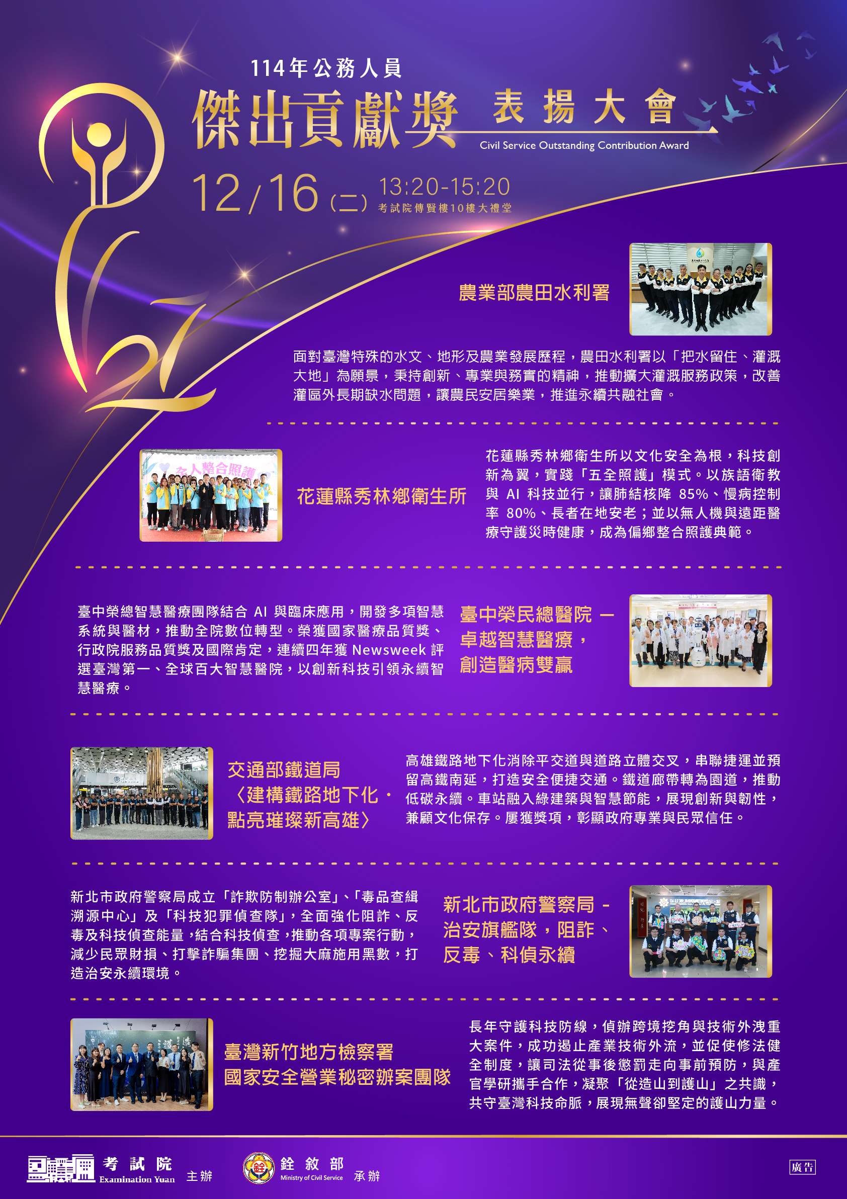 114年公務人員傑出貢獻獎業經考試院組成評審委員會評選 出6名得獎人及6組得獎團體;考試院為表揚得獎者傑出事 蹟,訂於114年12月16日(星期二)下午1時20分於該院傳 賢樓10樓大禮堂舉行表揚大會。