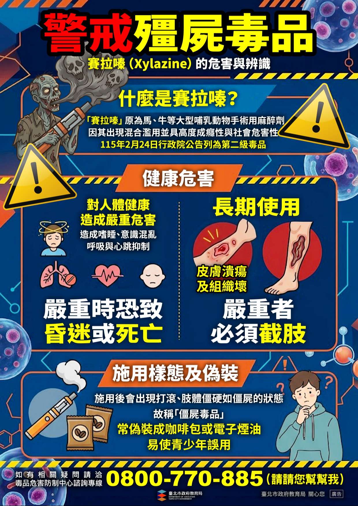 二、「賽拉嗪(Xylazine)」原為獸醫使用之麻醉藥物,近年遭濫用並常與其他毒品混合使用,施用後會出現打滾、肢體僵硬如僵屍的狀態, 故稱「僵屍毒品」。
