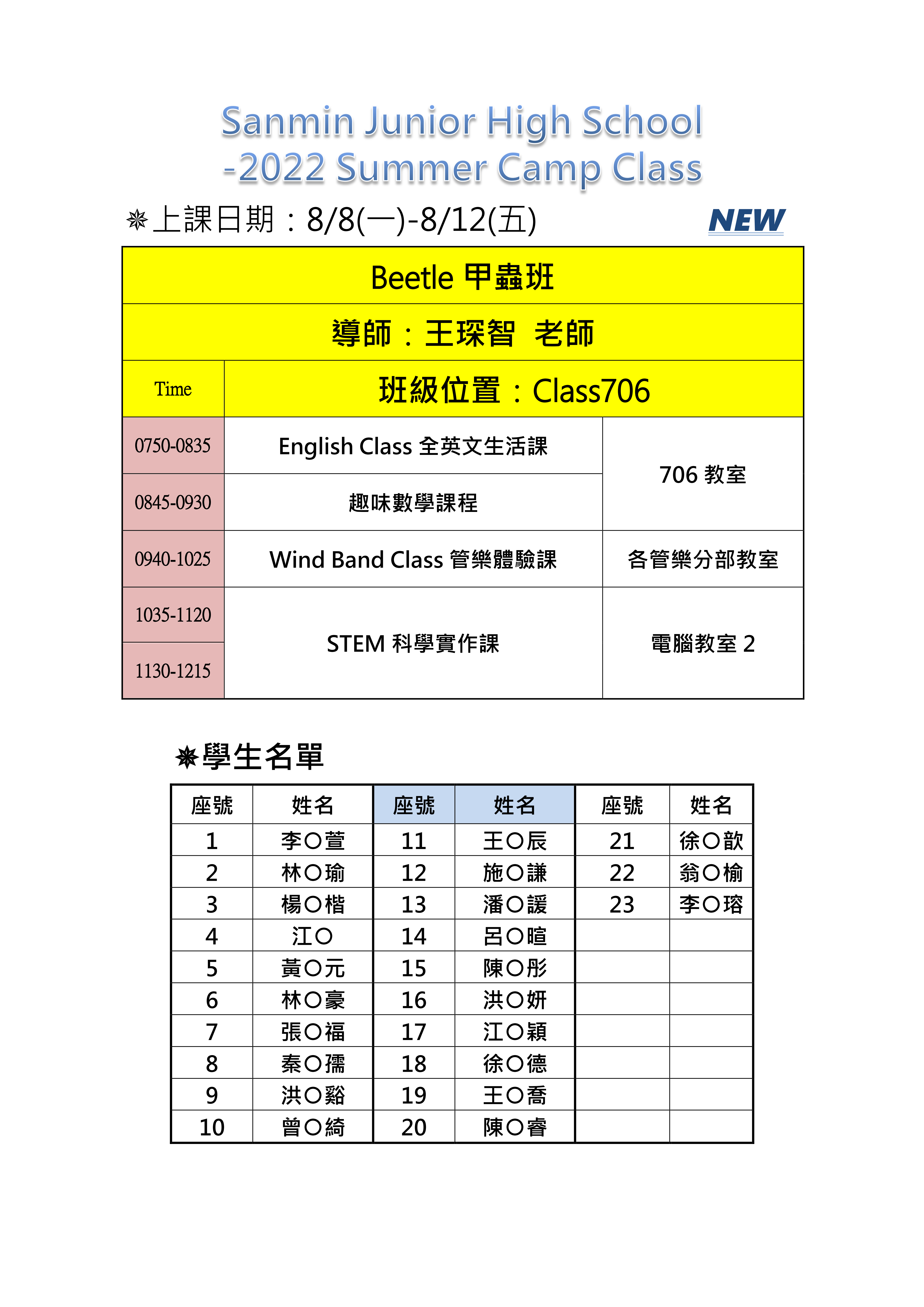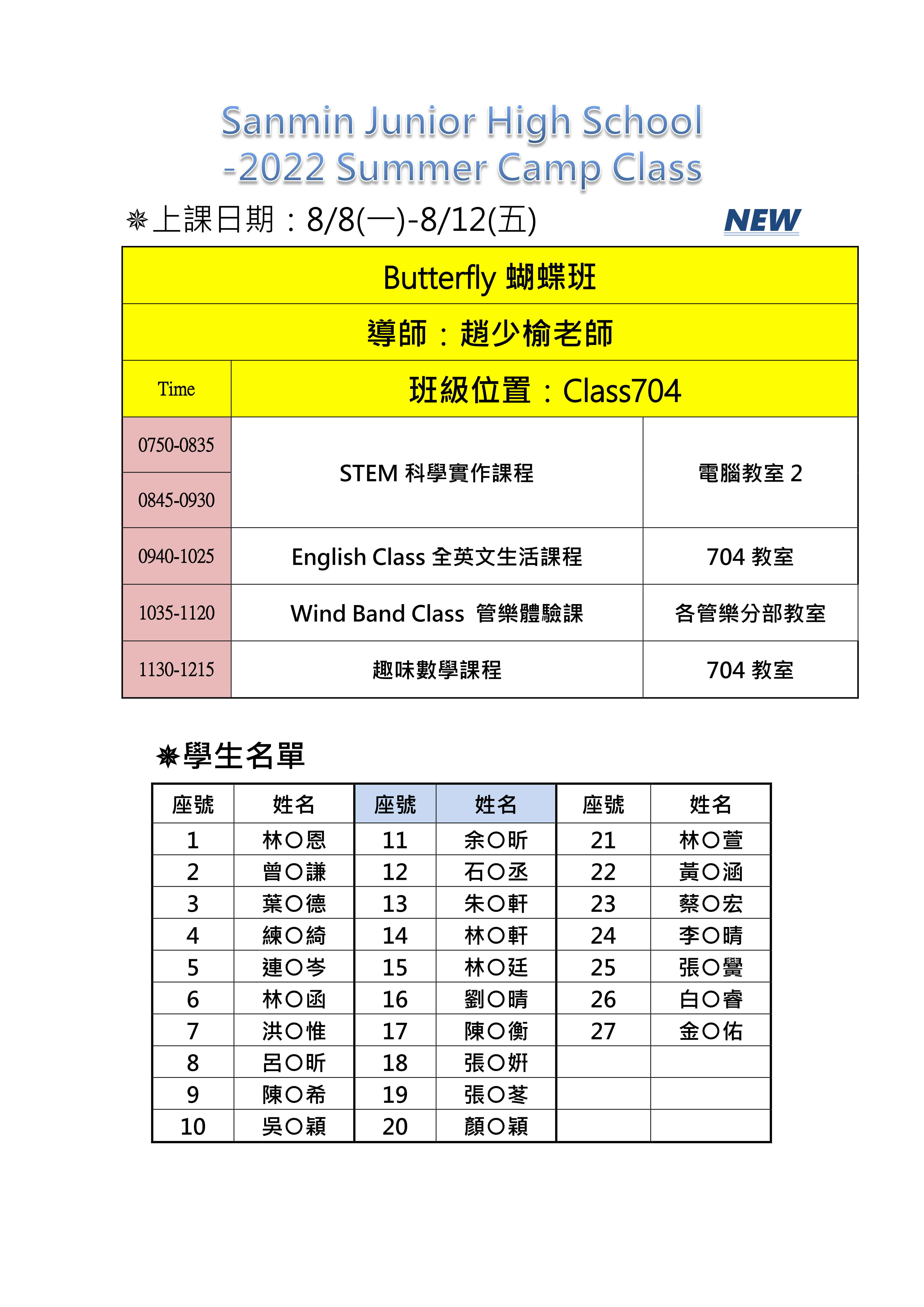 新生「暑期雙語暨亮點夏令營」課程及錄取名單再公告!
