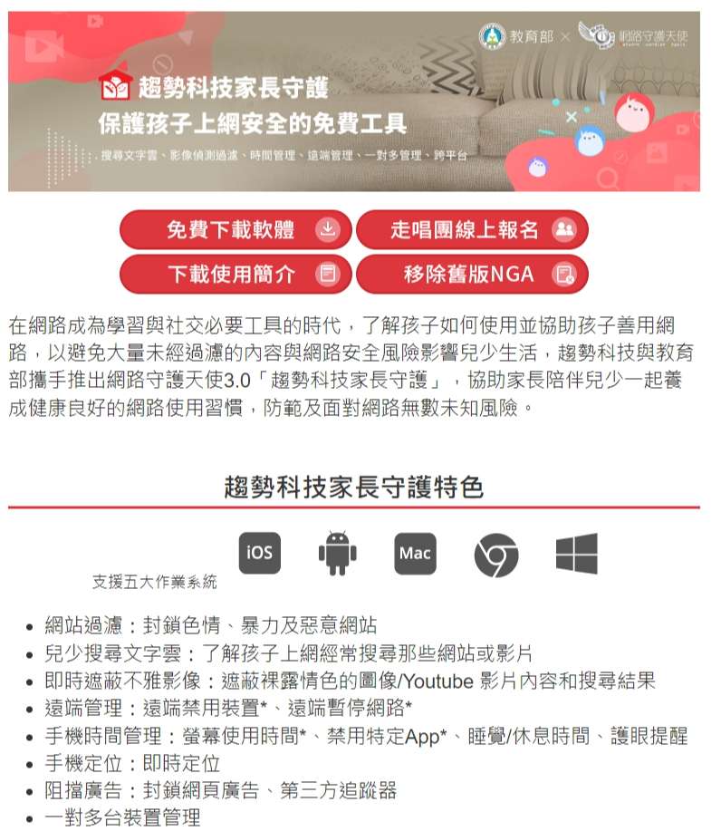 在網路成為學習與社交必要工具的時代,了解孩子如何使用並協助孩子善用網路,以避免大量未經過濾的內容與網路安全風險影響兒少生活,趨勢科技與教育部攜手推出網路守護天使3.0「趨勢科技家長守護」,協助家長陪伴兒少一起養成健康良好的網路使用習慣,防範及面對網路無數未知風險。