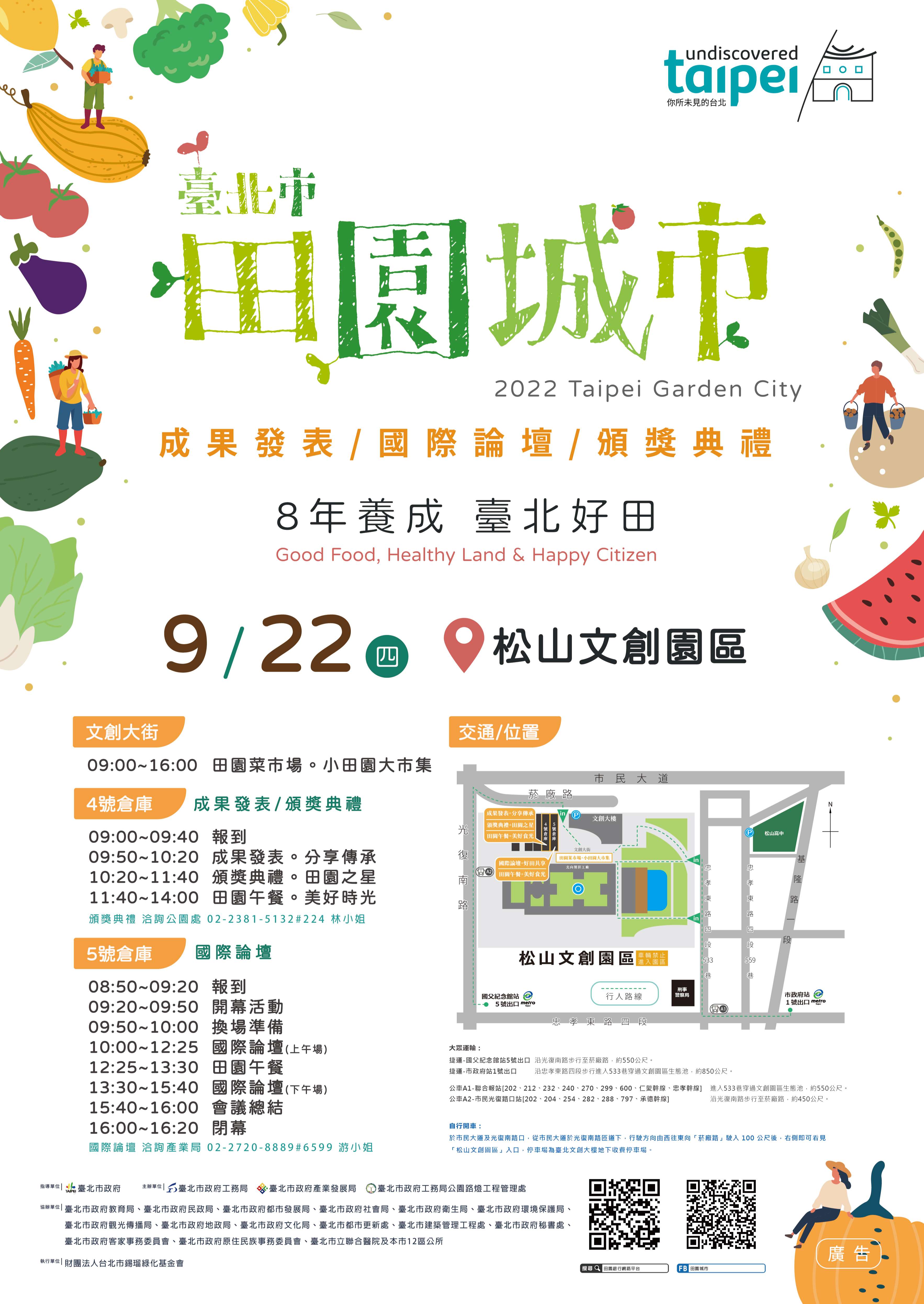 一、旨揭活動訂於111年9月22日(星期四)上午9時至下午4時於本市松山文創園區舉辦,活動主題含田園市集(文創大街)、頒獎典禮暨成果發表會(4號倉庫)及國際論壇(5號倉 庫)。