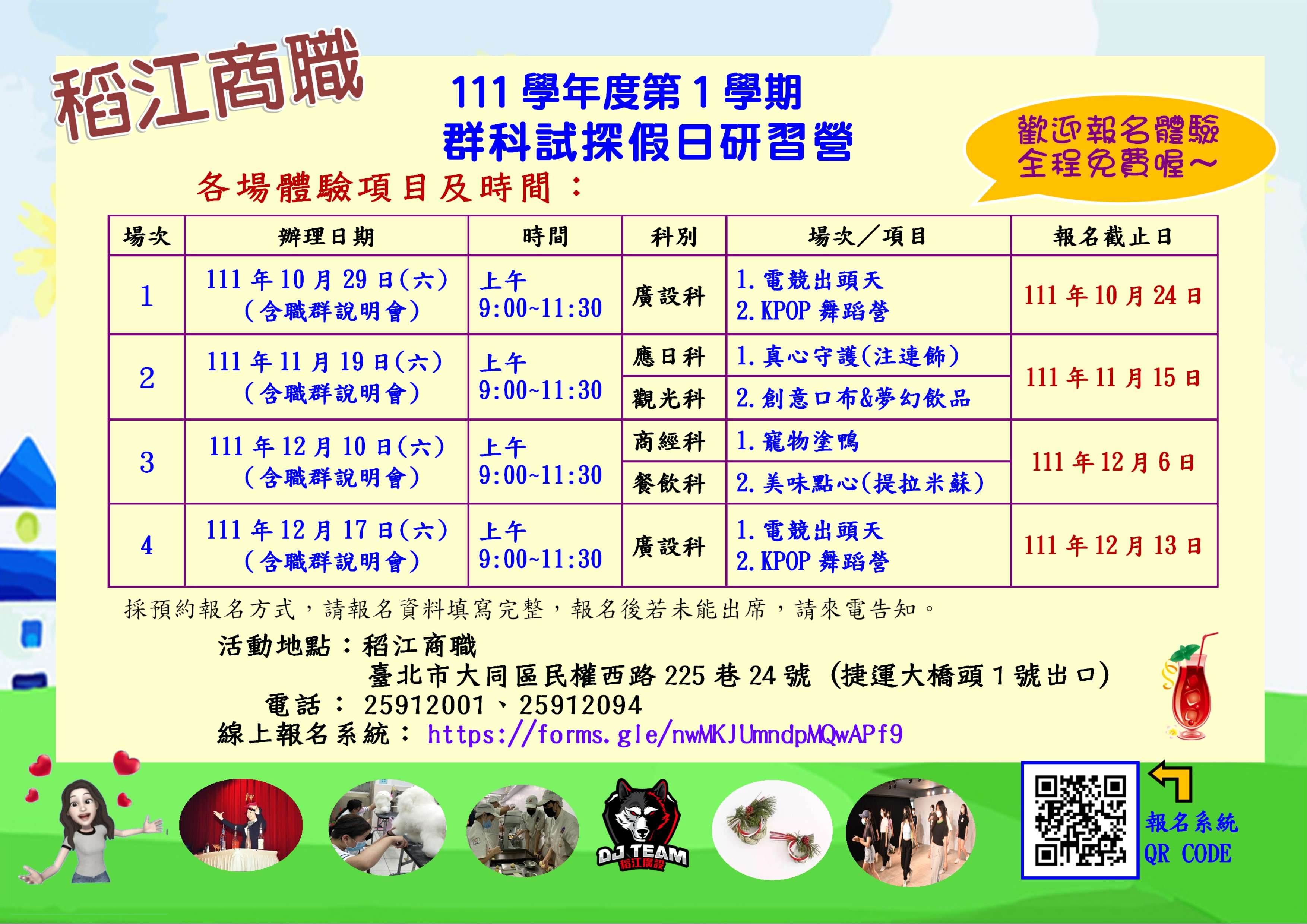 二、為了讓國中學生能對技職學校各群科多元探索,本學期本校辦理4場假日體驗活動及海報,如附件1、2,歡迎國中生踴躍至本校線上報名https://forms.gle/nwMKJUmndpMQwAPf9,參加體驗,活動全程免費。