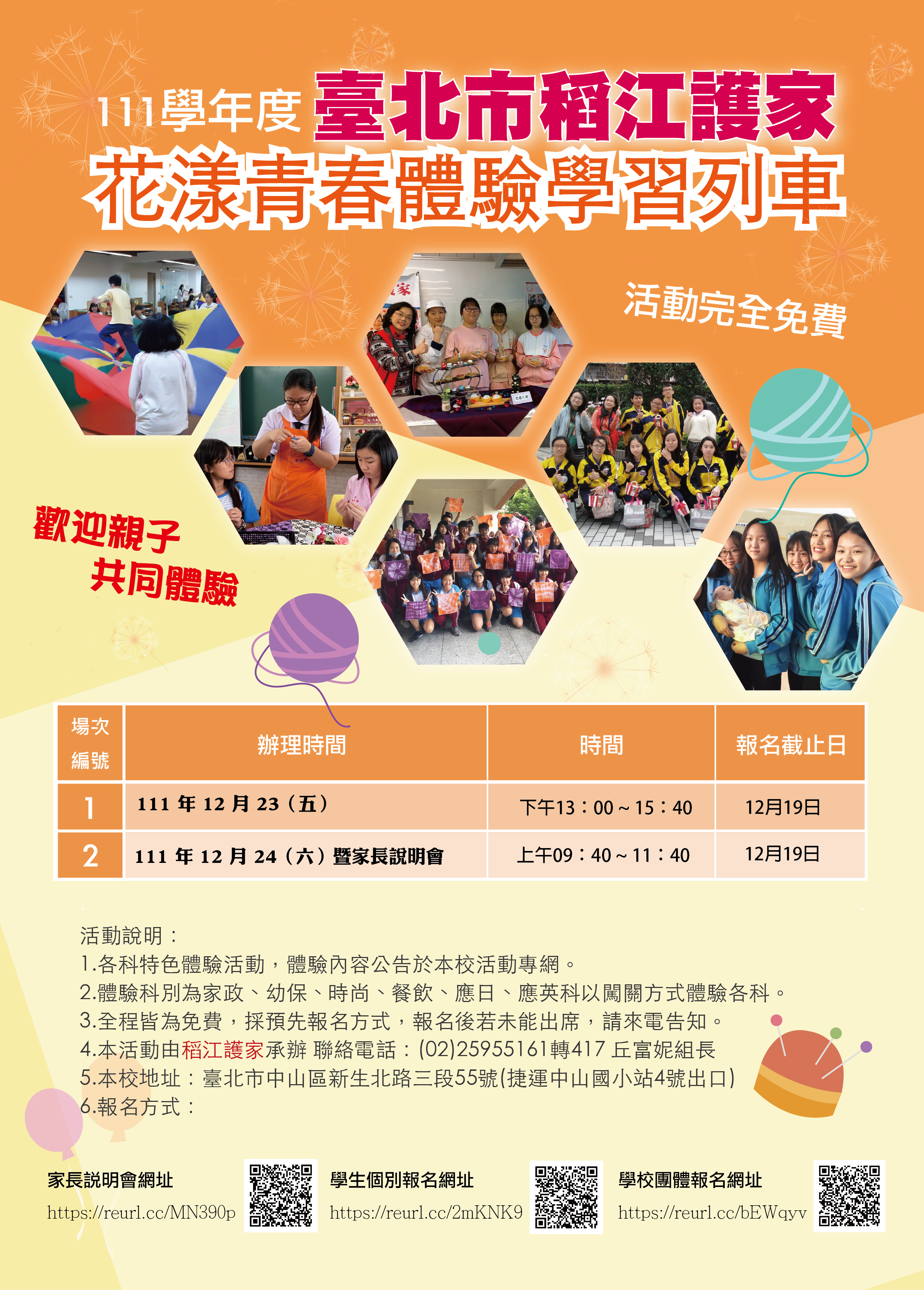 二、本學期於111年12月23日(五)、12月24日(六)辦理「稻江護家花漾群科體驗活動」,誠摯邀請 貴校八、九年級學生參