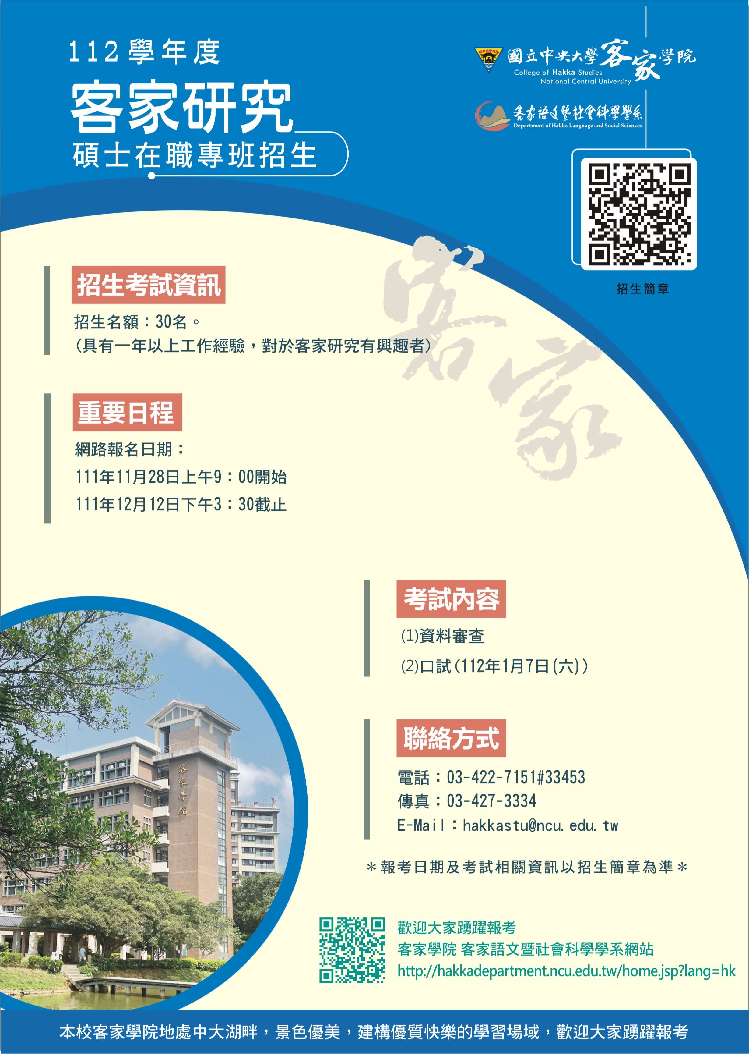 一、該校客家語文暨社會科學學系「客家研究碩士在職專班」