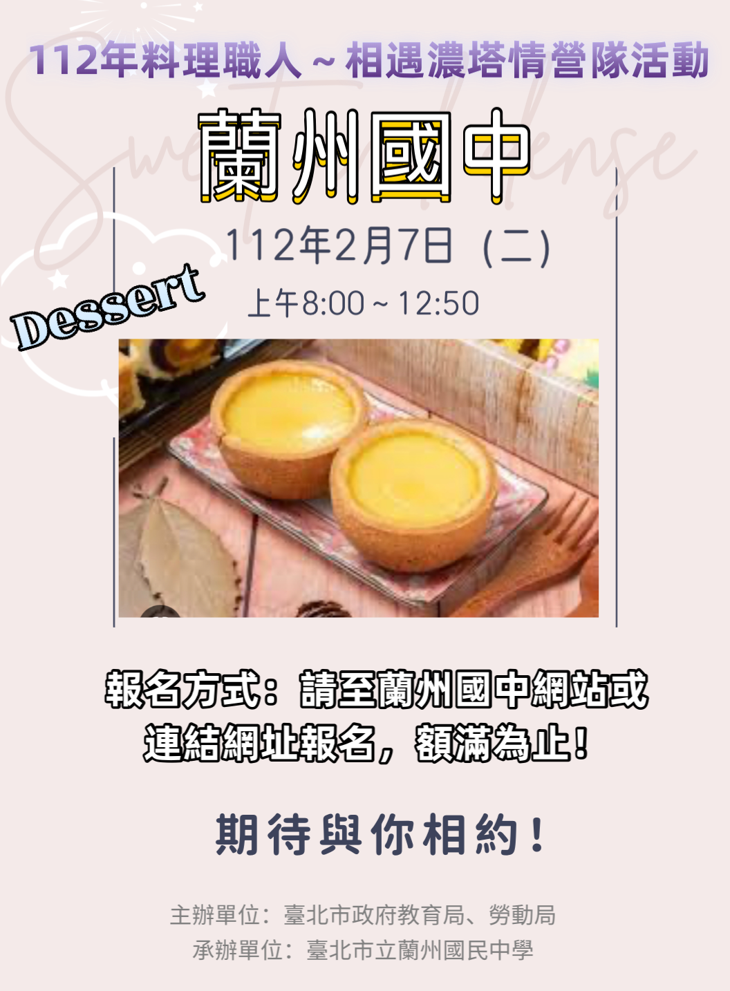 (五)報名方式:請至該校網站線上報名(https://www.lcjh.tp.edu.tw/nss/main/freeze/5a9759adef37531ea27bf1b0/8KHN2iY6395/63a50a9ee93a998bad406b61)填寫報名表,錄取名單依報名時間先後順序,額滿為止。