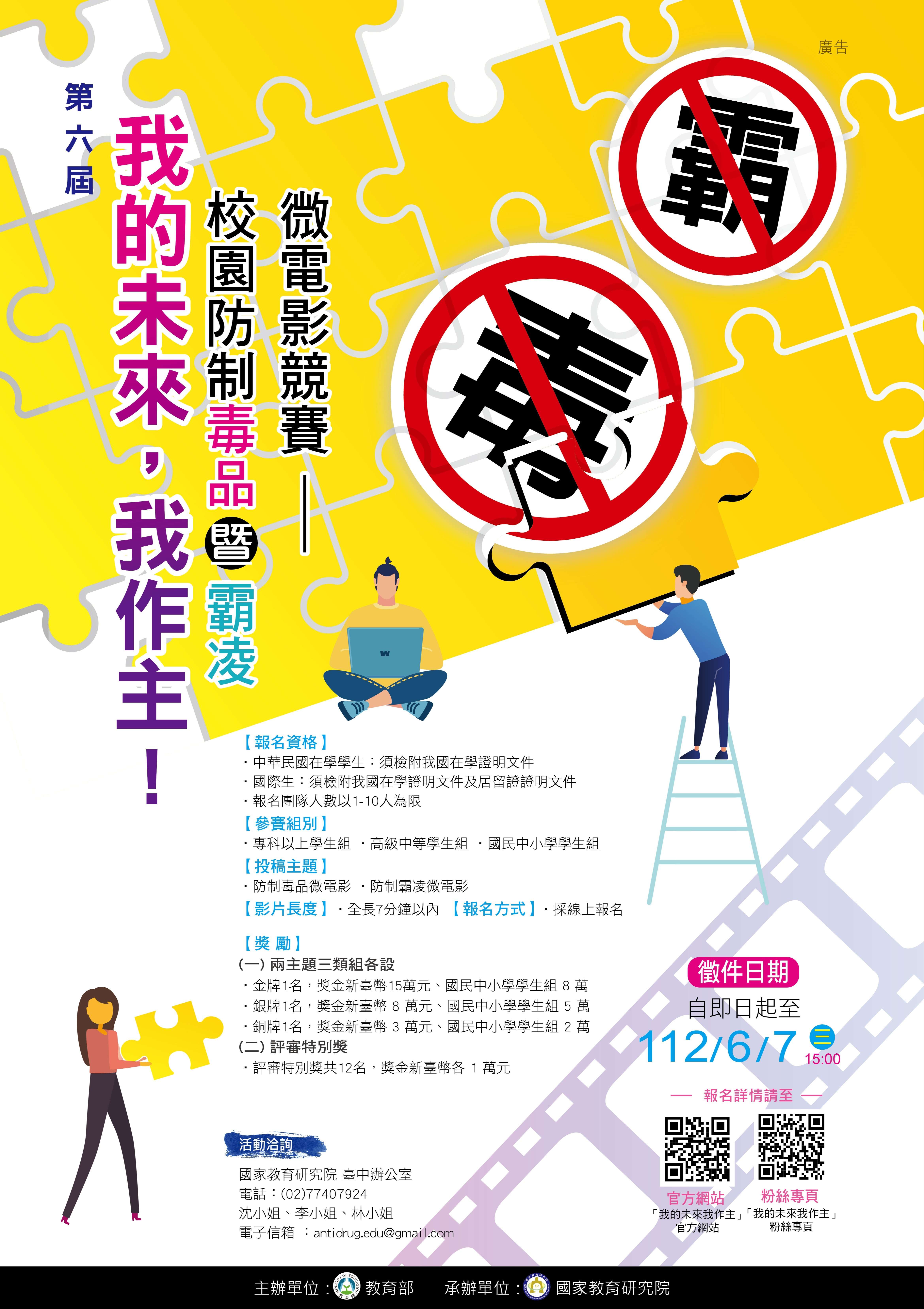 五、詳細競賽資訊請至「我的未來我作主」官方網站 (https://www.antidrug.tw/)以及「我的未來我作主-微 電影競賽臉書粉絲專頁」(www.facebook.com/antidrug. edu)查詢,或洽詢承辦單位,電話:02-77407924。