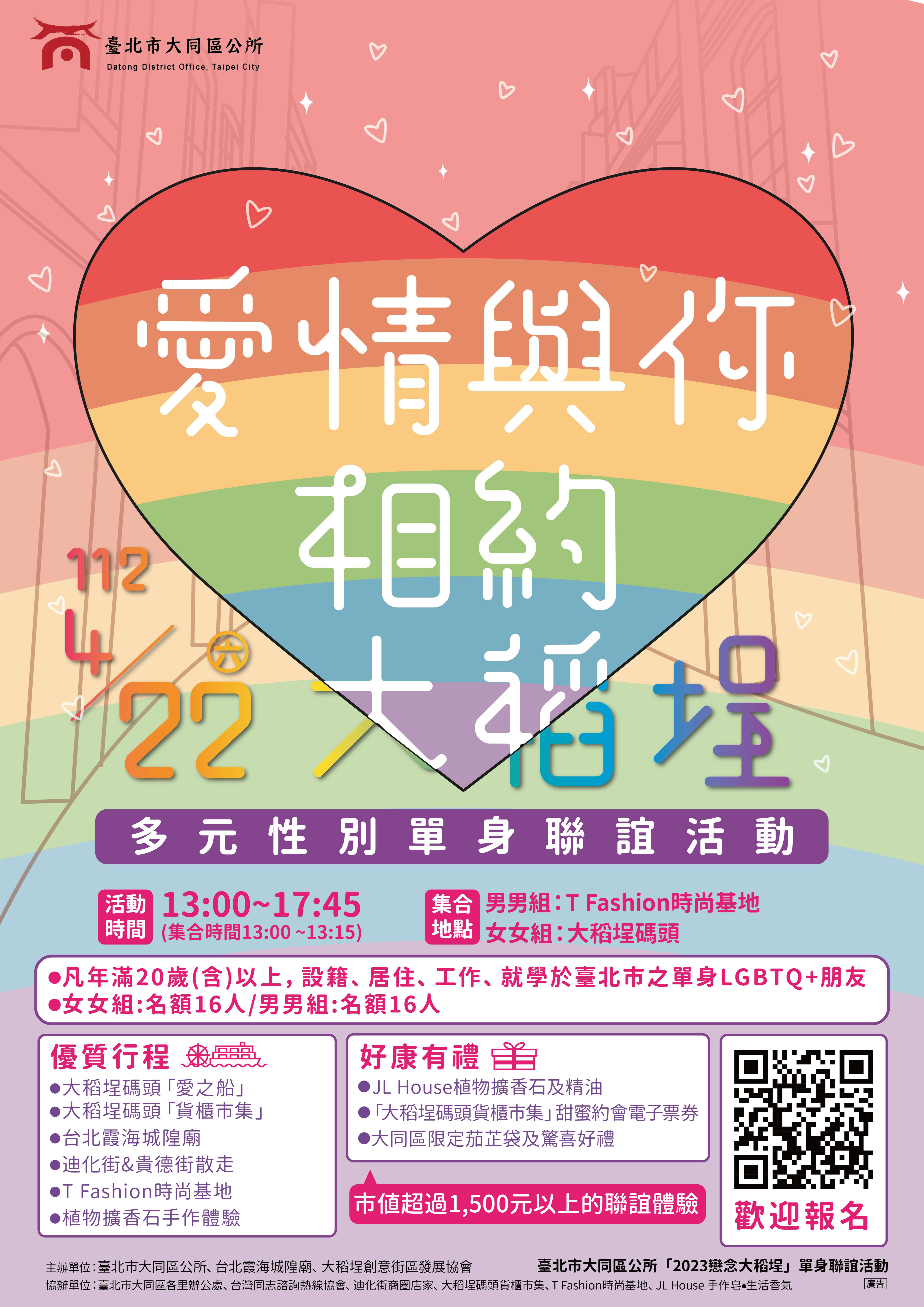 臺北市大同區公所『2023戀念大稻埕』多元性別單身聯誼活動,將於112年4月22日(六)下午1時至5時45分,假迪化街商圈街區及大稻埕碼頭舉辦,凡年滿20歲(含)以上,設籍、居住、工作或就學於臺北市之單身同志朋友皆可參加,總計32個名額,男男組、女女組各16名,免參加費用、免保證金,詳情請見活動宣傳海報或線上報名網址(https://forms.gle/QoopCBbGG994EFRm7)或電洽(02)25975323轉806大同區公所古小姐。