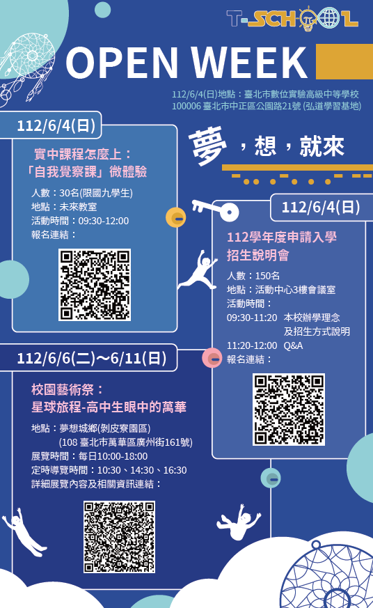 一、本校於111學年度第二學期辦理招生說明會,進行本校特色介紹,提供貴校學生多元升學進路與生涯規劃。另為展示本校課程成果,結合臺北市高中職招生博覽會與本校校慶活動,辦理Open Week校園開放週活動,懇請轉知貴校學生及家長相關活動訊息並敬邀蒞臨。