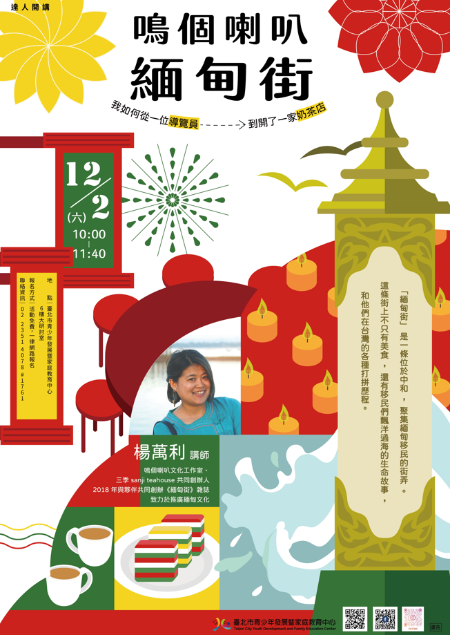 臺北市青少年發展暨家庭教育中心12月2日10:00舉辦達人開講「鳴個喇叭緬甸街—我如何從一位導覽員到開了一家奶茶店」,鳴個喇叭文化工作室共同創辦人楊萬利老師與您分享在推動成為臺灣與緬甸社群的文化橋樑路上,一路上的心路歷程。活動免費,詳見青發家教中心官網。
