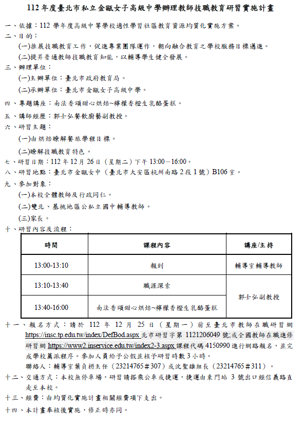 一、依據臺北市教育局高級中等學校適性學習社區教育資源均質化計畫辦理,定於民國112年12月26日(星期二)下午13時00分至16時00分時於本校B106室辦理【南法香頌甜心烘焙~檸檬香橙生乳酪蛋糕】研習,邀請教師參與技職教育研習。