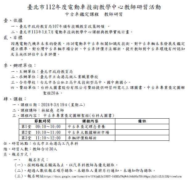 一、依據臺北市政府教育局107年頒布技職教育政策綱領及臺北市113年1至7月電動車技術教學中心課程與教學實施計畫辦理。