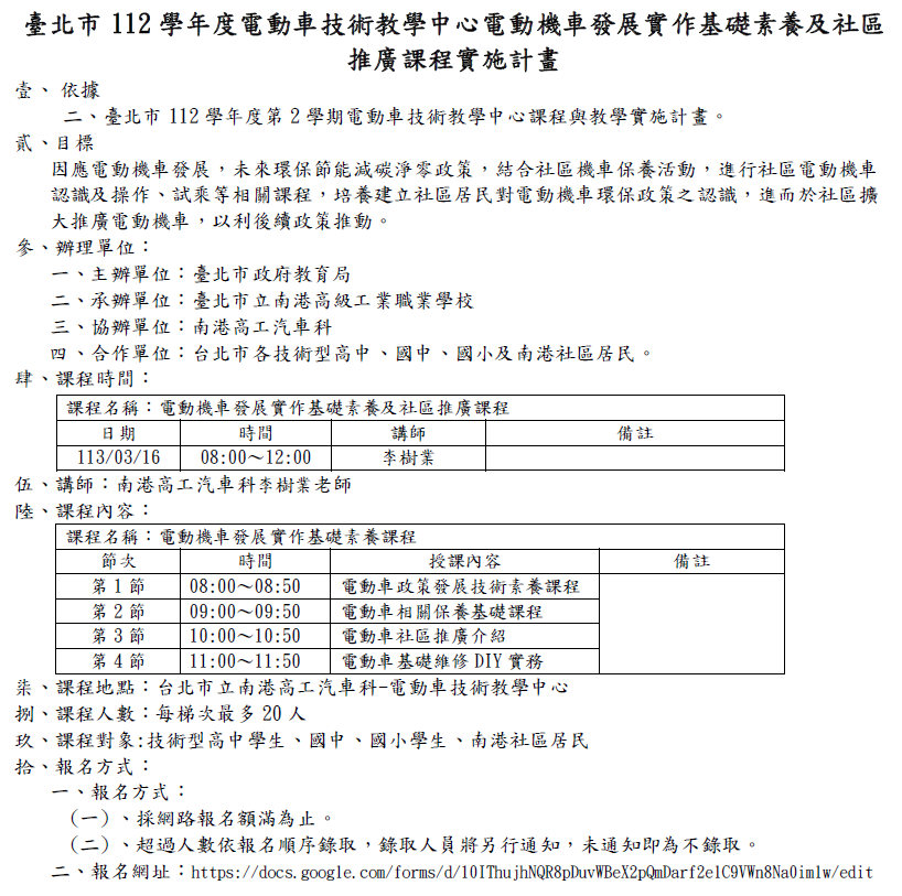 一、依據臺北市112學年度第2學期電動車技術教學中心課程與教學實施計畫辦理。