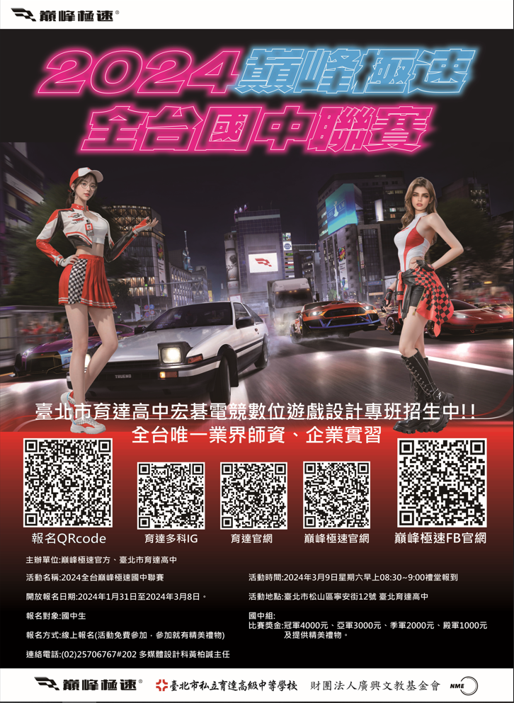 一、巔峰極速舉辦「2024巔峰極速全台國中聯賽」,定於2024年3月9日(星期六)比賽。