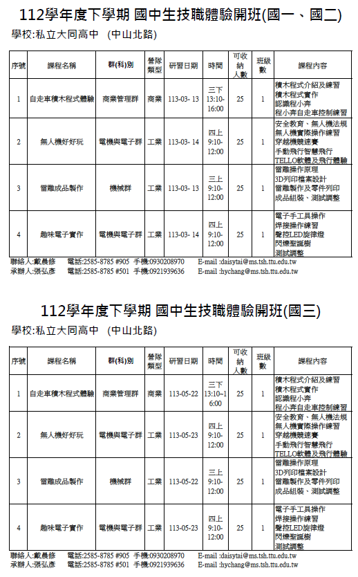 二、體驗課程分年級報名參加、共有八個場次可供挑選,詳情請參閱附件一,歡迎來電或來信報名參加。