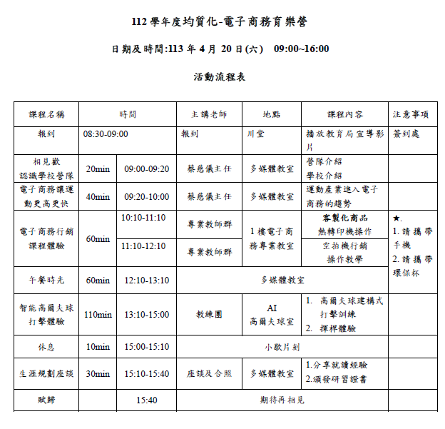 (五)課程:客製化商品熱轉印機操作、空拍機行銷操作、智能高爾夫球打擊體驗。
