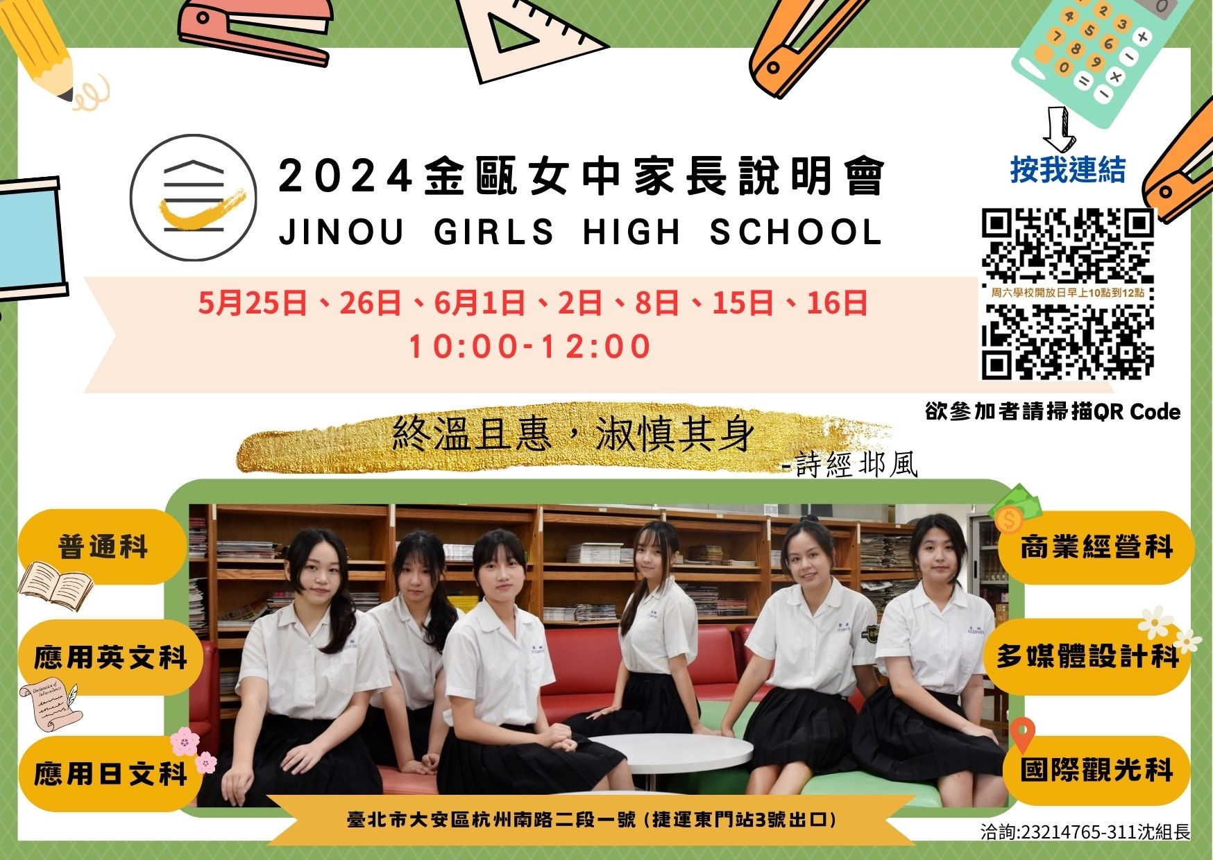 二、報名方式:即日起至113年6月15日(星期六)止,請逕至金甌女中首頁(網址:https://www.cogsh.tp.edu.tw/home)或直接至Google表單(網址:https://forms.gle/EPBVKaAMf1hcdneRA)報名參加。
