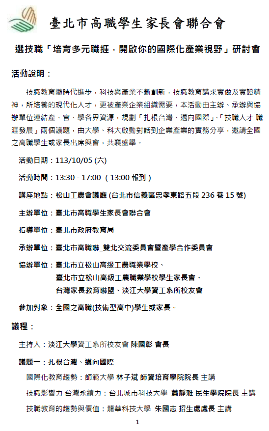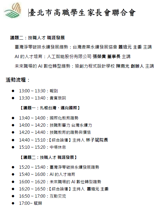 二、該會為整合產、官、學各界資源,並提供高職學生、家長就學及就業相關資訊,特辦理旨揭研討會,說明如下: