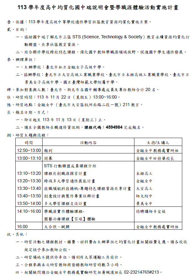 六、報名方式:即日起至113年11月13日(星期三)止,請逕至全國教師在職進修資訊網(課程代碼:4594984),全程參與核予研習時數3小時。