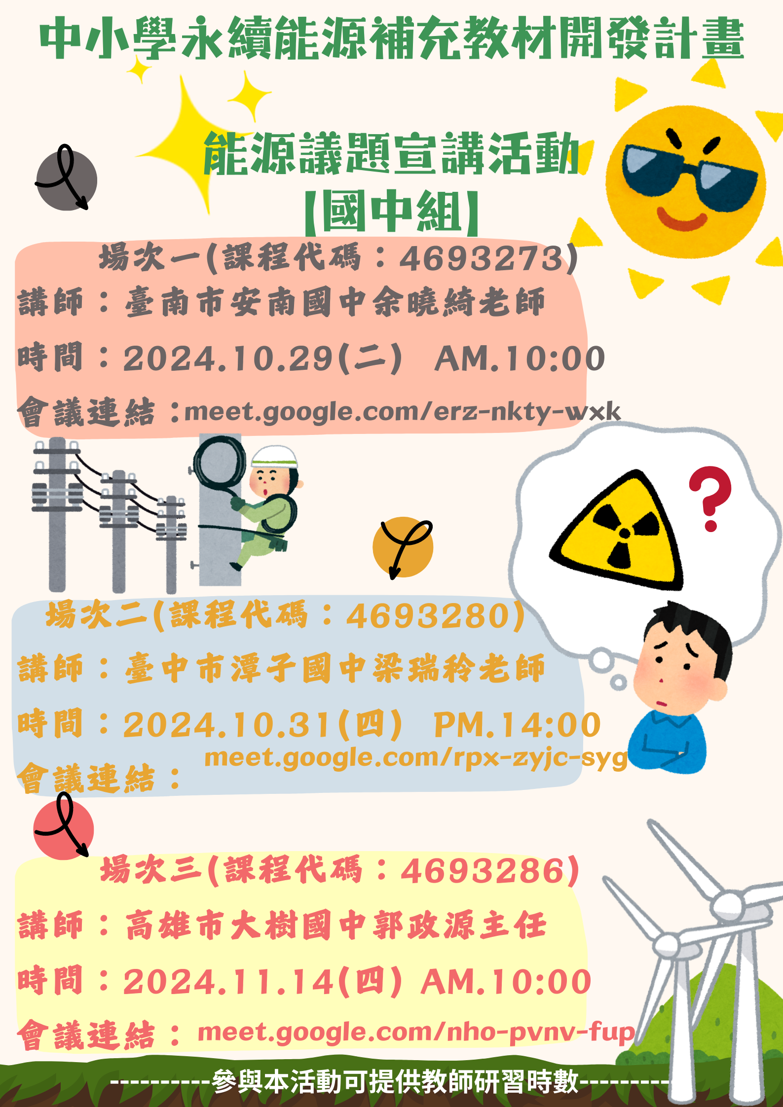 (一)【國中組】場次一(課程代碼:4693273);講師:臺南 市安南國中余曉綺老師;時間:113年10月29日(星期二)上午10時0分至11時30分;Google Meet連結:meet. google.com/erz-nkty-wxk。