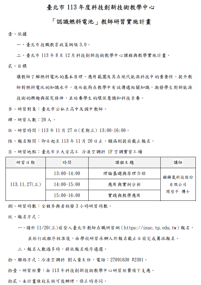 一、依據臺北市技職教育政策綱領3.0與臺北市科技創新技術教學中心113年度8-12月計畫辦理。