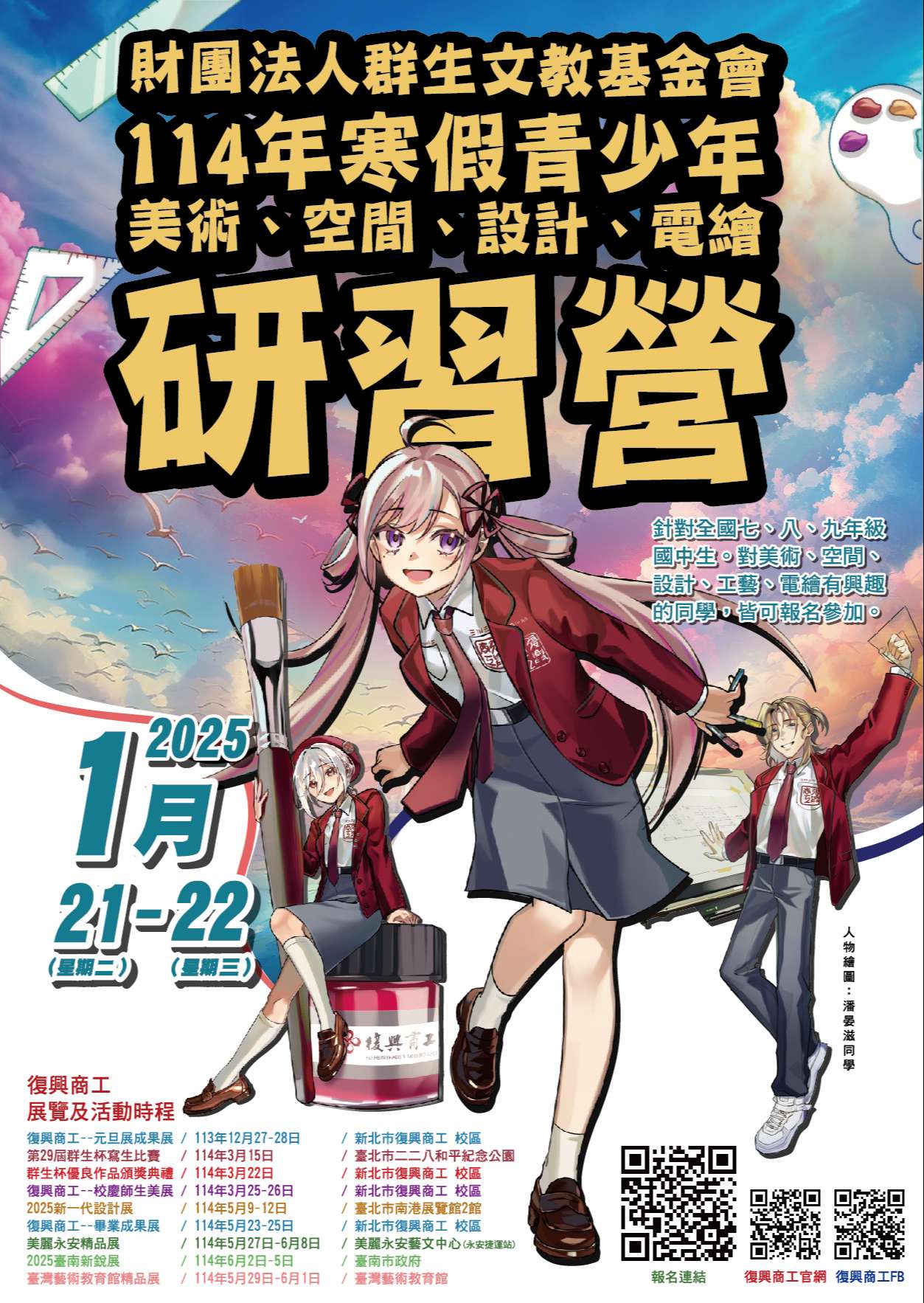 三、參加對象:凡全國國中七、八、九年級,對美術、設計、 工藝、電腦有興趣者,皆可報名參加,有報名學生之國中 老師,可免費參加研習營(各班別限5名老師,額滿為 止)。