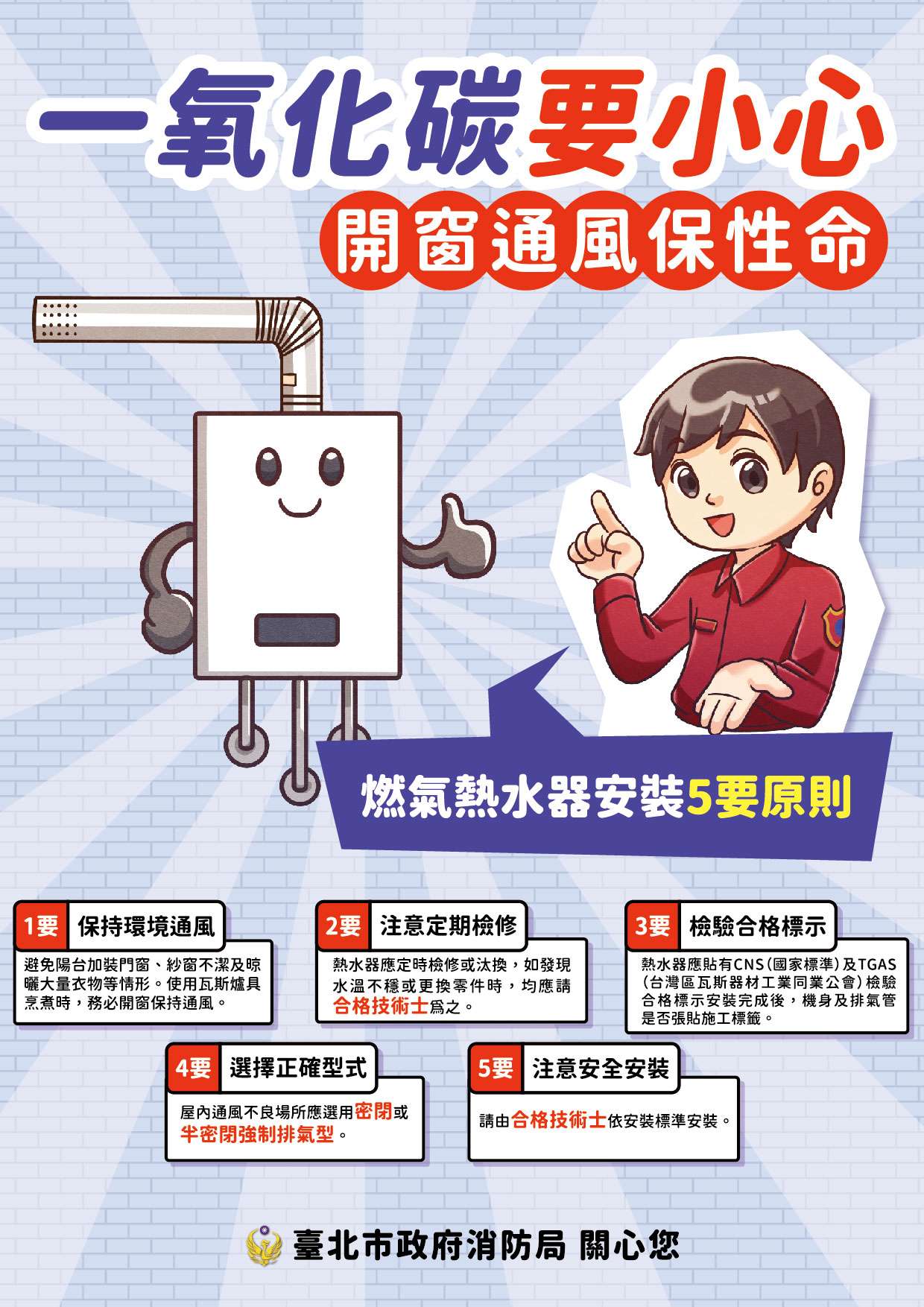 時序進入秋冬季節,氣溫下降,民眾使用熱水器時間大幅 提升,為提醒民眾熱水器使用應注意事項,避免造成一氧化碳中毒。相關圖片影片請參考附件,謝謝!