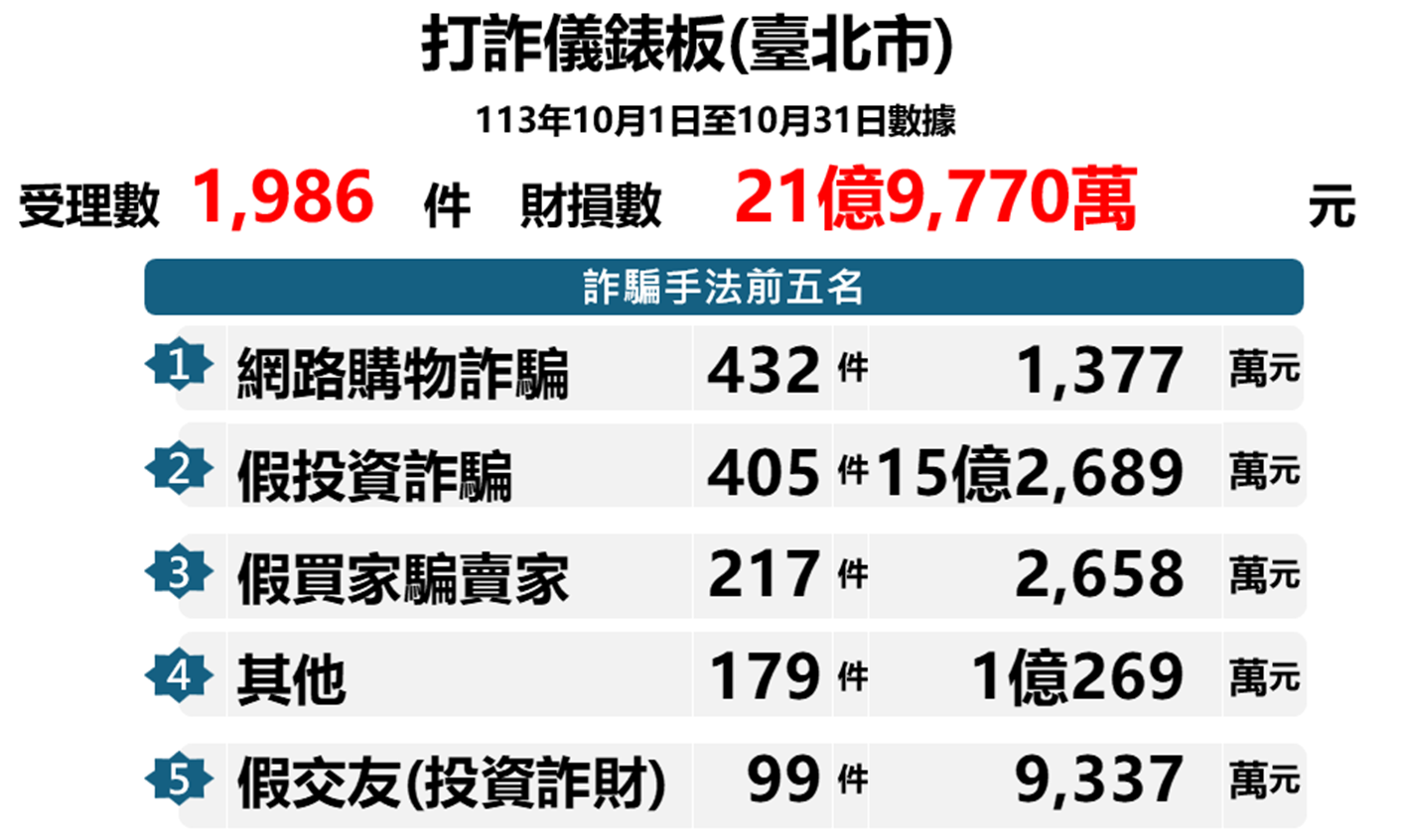 二、經本市府警察局分析本市113年10月份各類詐欺案件發生數共計1,986件,詐騙案件類型如下:
