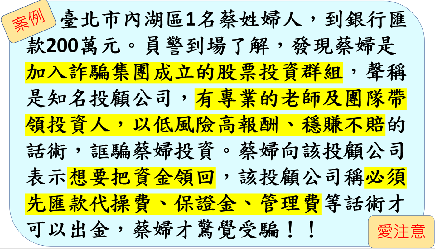 三、近年來本市府警察局為因應假投資詐欺、網路購物詐欺、假買家騙賣家為前3大高發詐欺手法,又AI深偽詐騙為新型態涉詐欺手法彙整宣導圖文素材4張(含10月份打詐儀表板、手法話 術、案例)(如附件,)影片1部(本校規劃於電子布告欄,以利本校教職員工及學生觀看)。