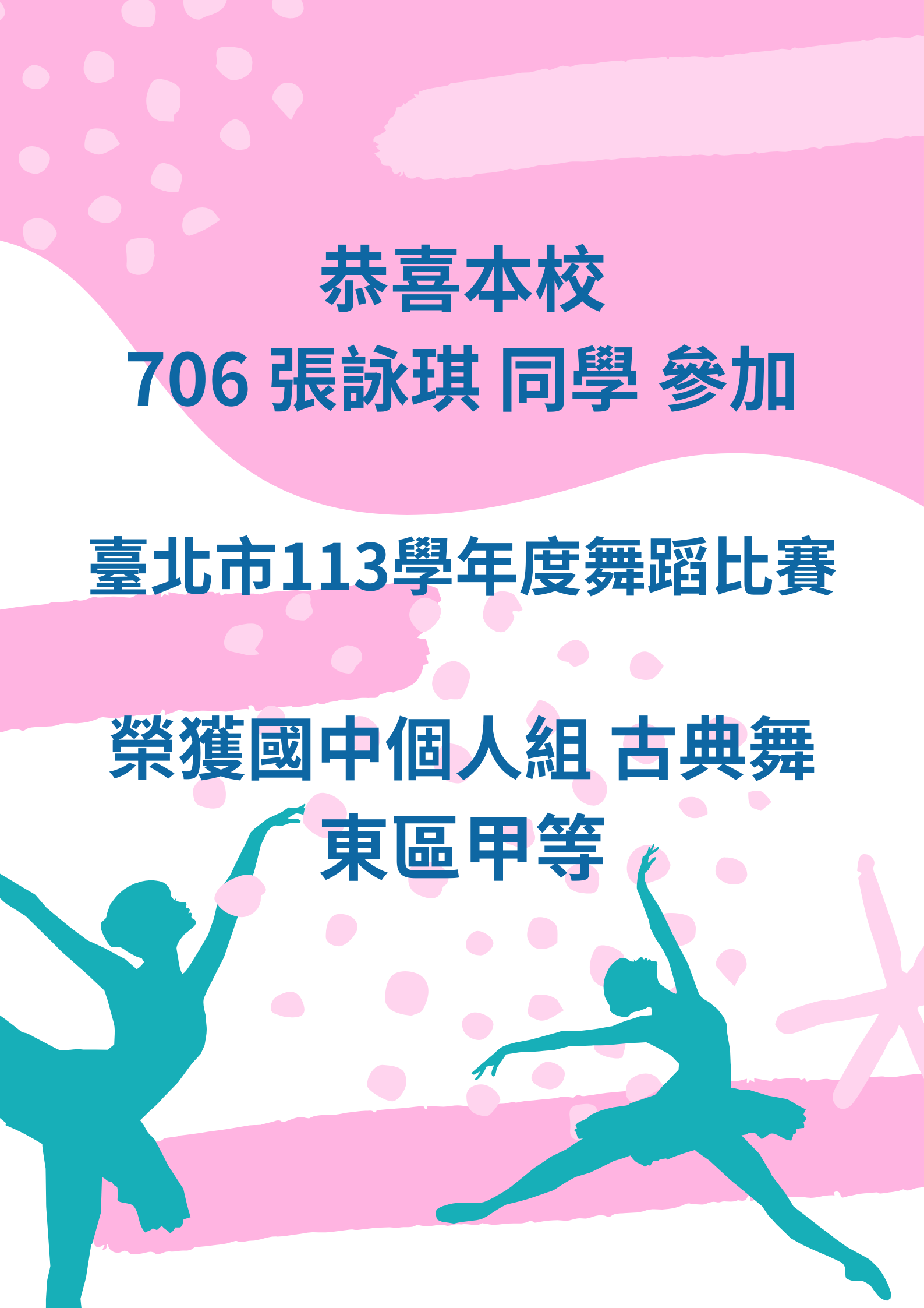 賀本校706張O祺同學參加臺北市113學年度舞蹈比賽國中個人組古典舞東區甲等 本校全體師生同賀
