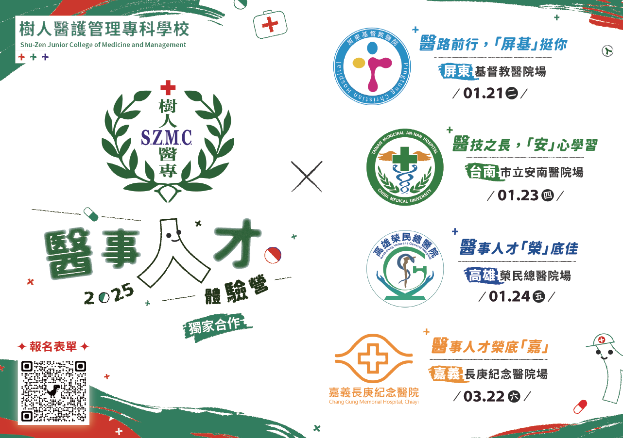 一、樹人醫護管理專科與「台南市立安南醫院」、「高雄榮民總醫院」、 「屏東基督教醫院」及「嘉義長庚紀念醫院」共同辦理:實地走訪醫院活動,讓學生感受實質的醫療場域及技術,可以更理解醫事教育並啟發對醫事領域的興趣,對未來生涯規劃有所助益或引導確認學習目標。